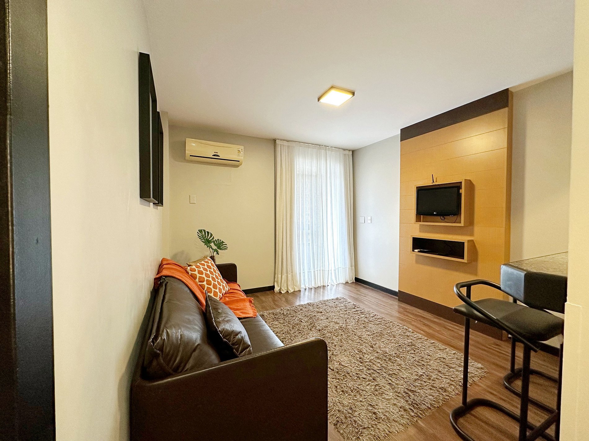 Dispõe de 1 quarto, sala, cozinha, varanda, espaço para utilização de laptop e banheiro.