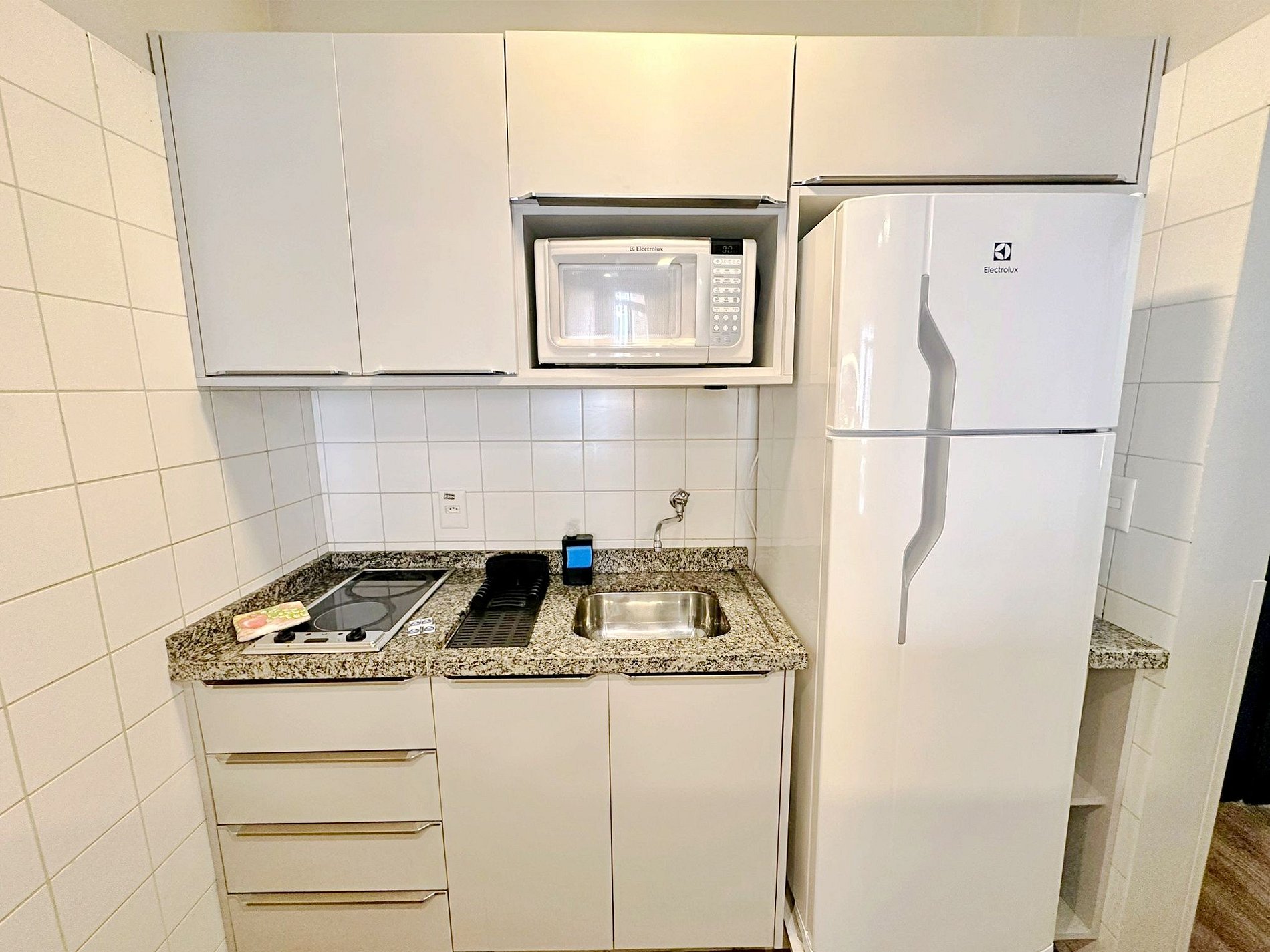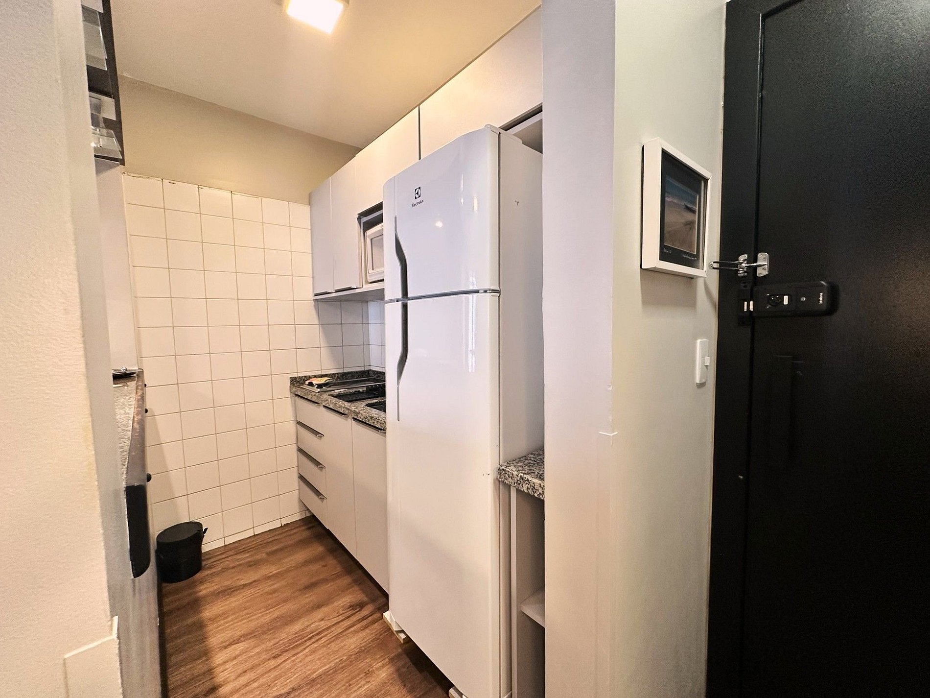 Apartamento possui cozinha de flat equipada com fogão elétrico 2 bocas, frigobar, micro-ondas e pia. Também tem a disposição pratos, talheres, copos, xícaras, panela, frigideira e leiteira.