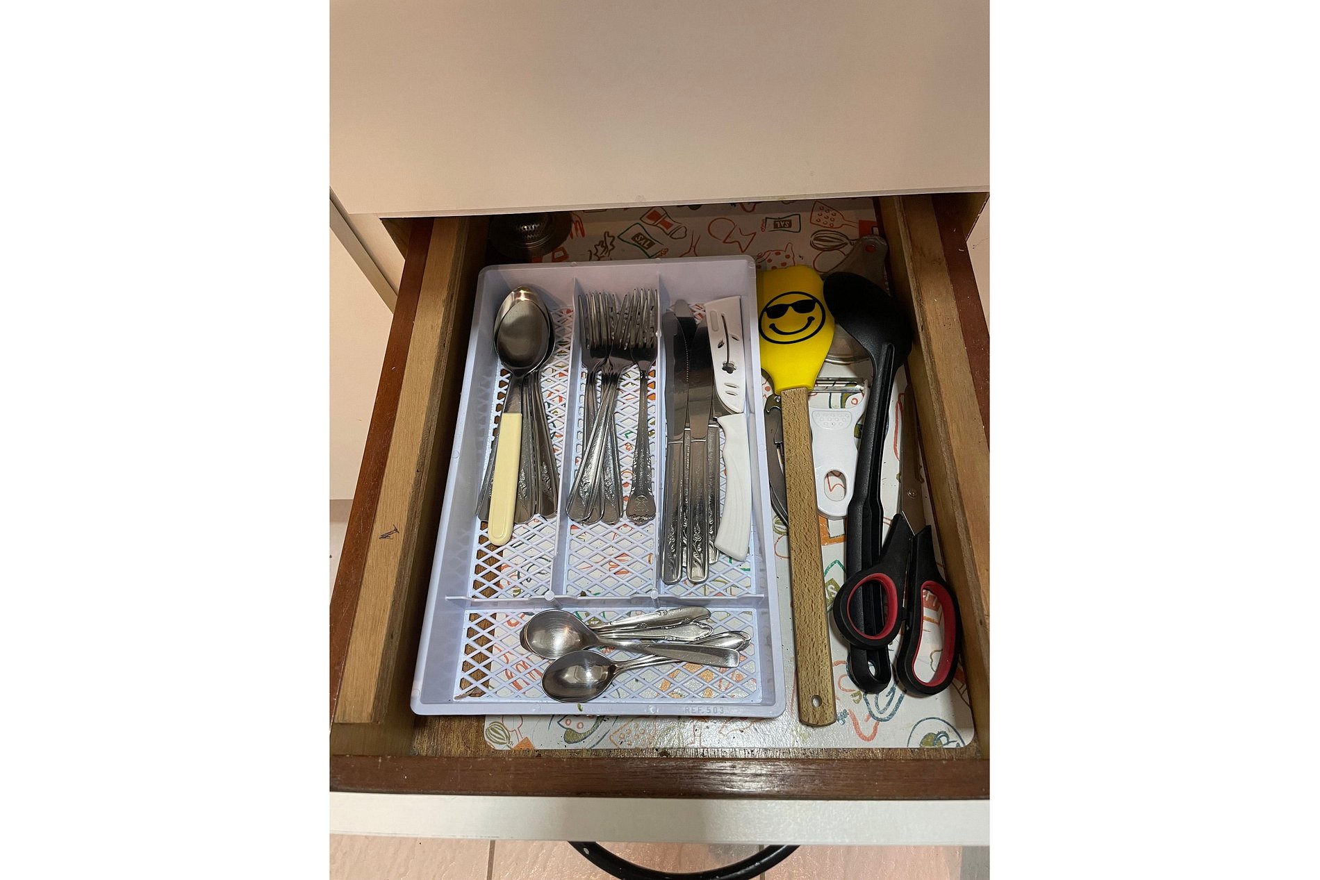 Apartamento possui cozinha de flat equipada com fogão elétrico 2 bocas, frigobar, micro-ondas e pia. Também tem a disposição pratos, talheres, copos, xícaras, panela, frigideira, leiteira, cafeteira e sanduicheira.