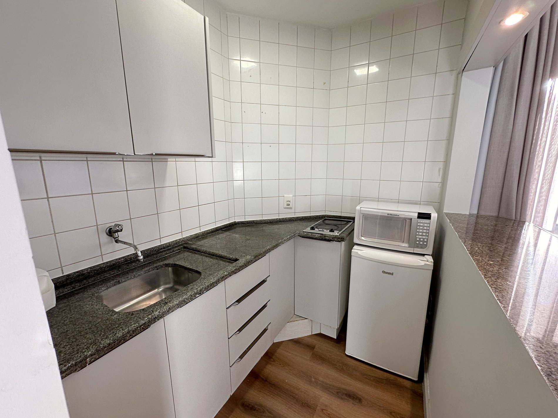 Apartamento possui cozinha de flat equipada com fogão elétrico 2 bocas, frigobar, micro-ondas e pia. Também tem a disposição utensílios de cozinha.