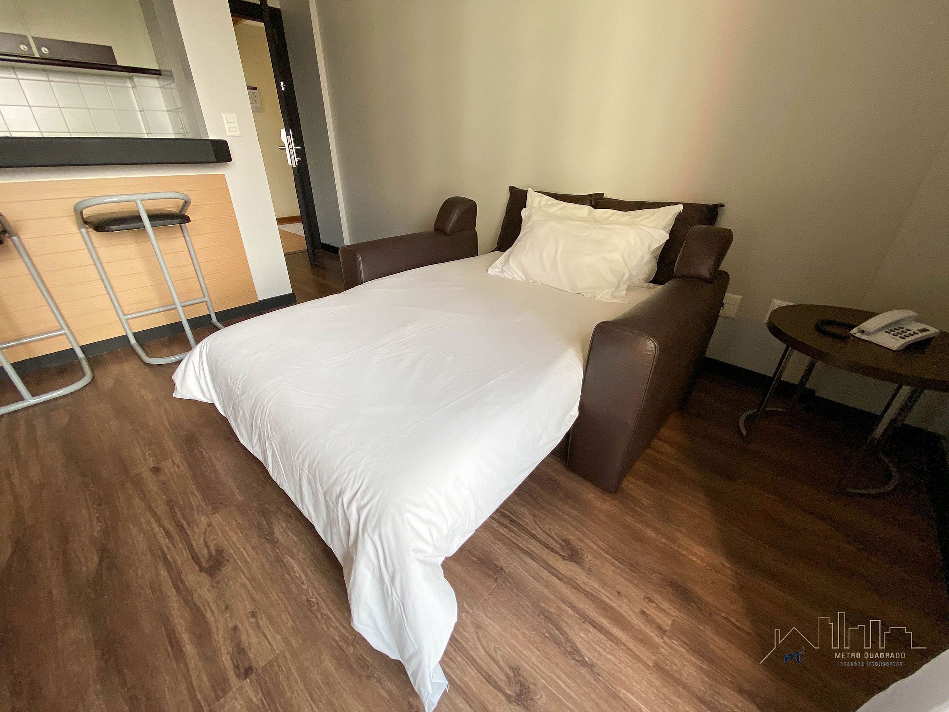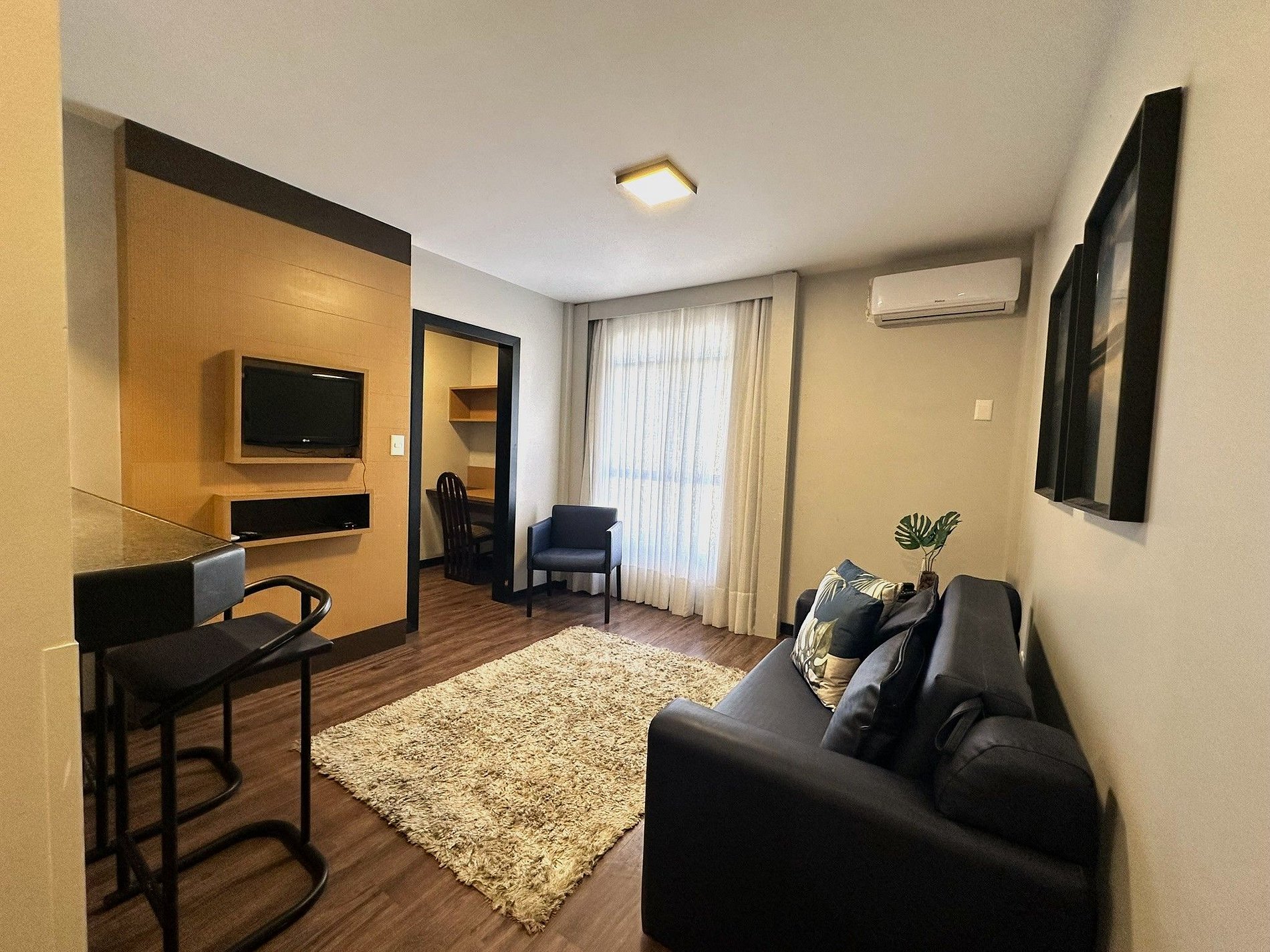 Dispõe de 1 quarto, sala, cozinha, espaço para utilização de laptop e banheiro. O sofá-cama da sala é confortável e acomoda 1 pessoa.