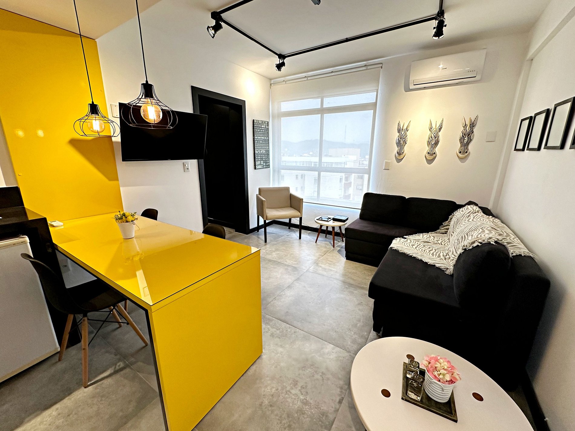 A decoração foi pensando num loft industrial, mas não deixamos de lado a ousadia de cores fortes e elementos que trazem aconchego e identidade ao apartamento.