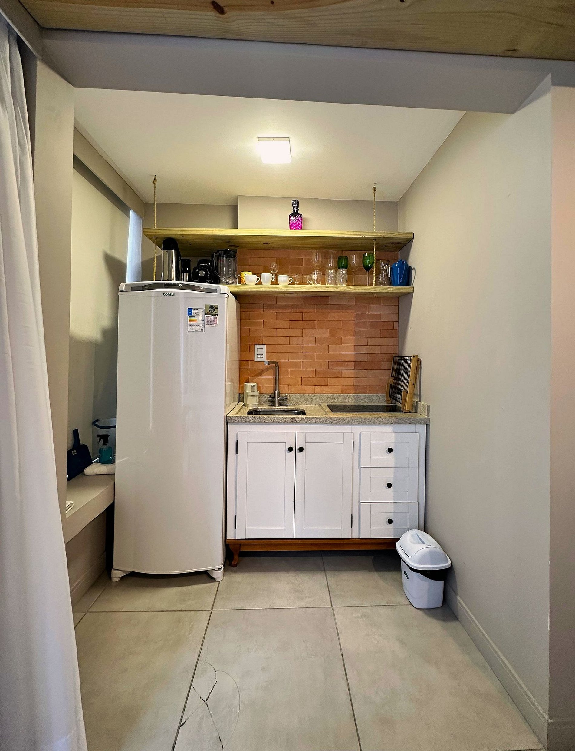 O mesmo dispõe de um quarto aconchegante para casal integrado com a sala e cozinha, com ar-condicionado. Sala de estar com sofá com 2 lugares, Smart TV e mesa para refeições. Cozinha completa com fogão por indução, micro-ondas, geladeira e utensílios básicos que proporcionam uma estadia confortável. Possui um banheiro social.