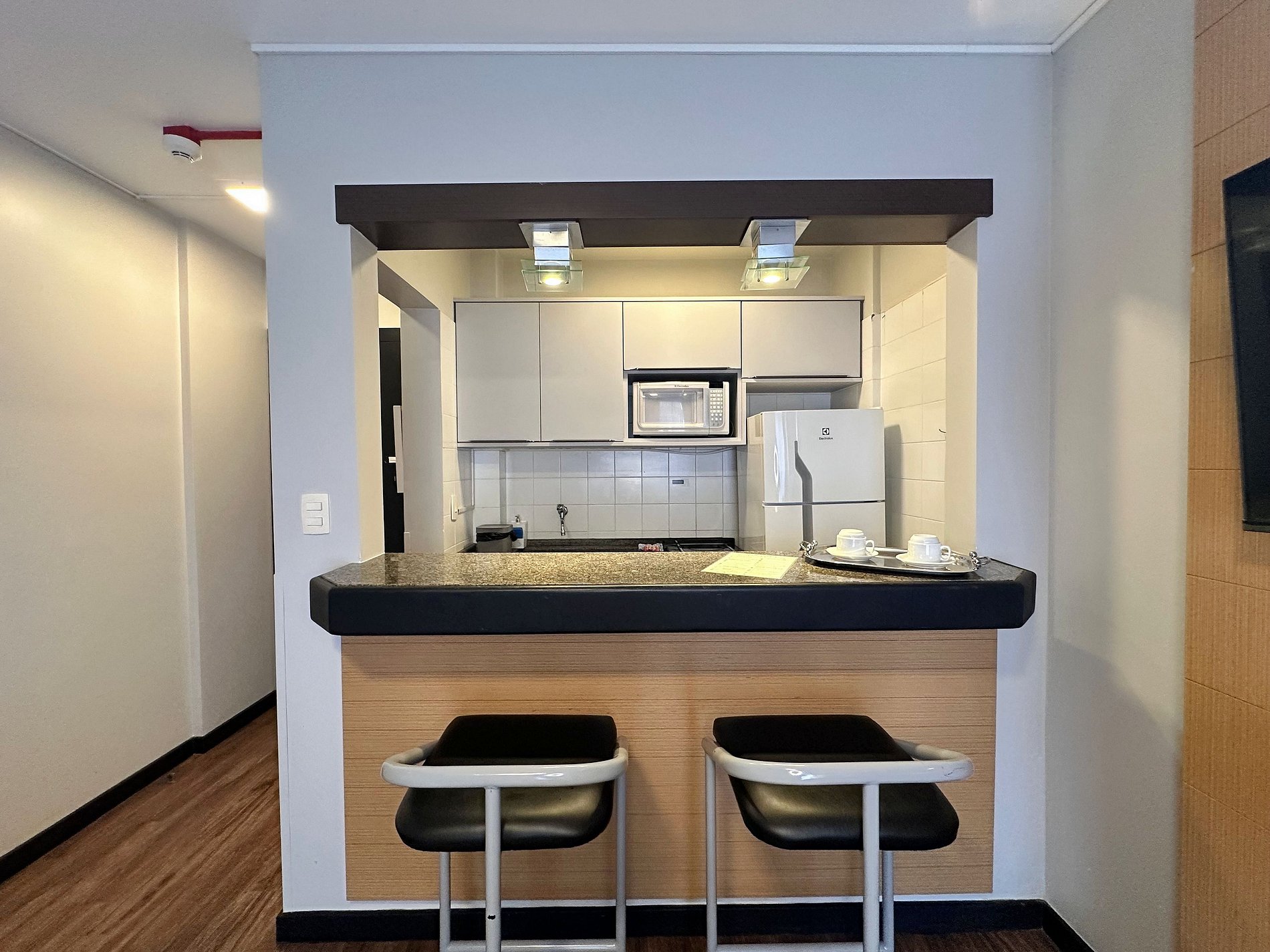 Apartamento possui cozinha de flat equipada com fogão elétrico 2 bocas, frigobar, micro-ondas e pia. Também tem a disposição pratos, talheres, copos, xícaras, panela, frigideira, leiteira e cafeteira.