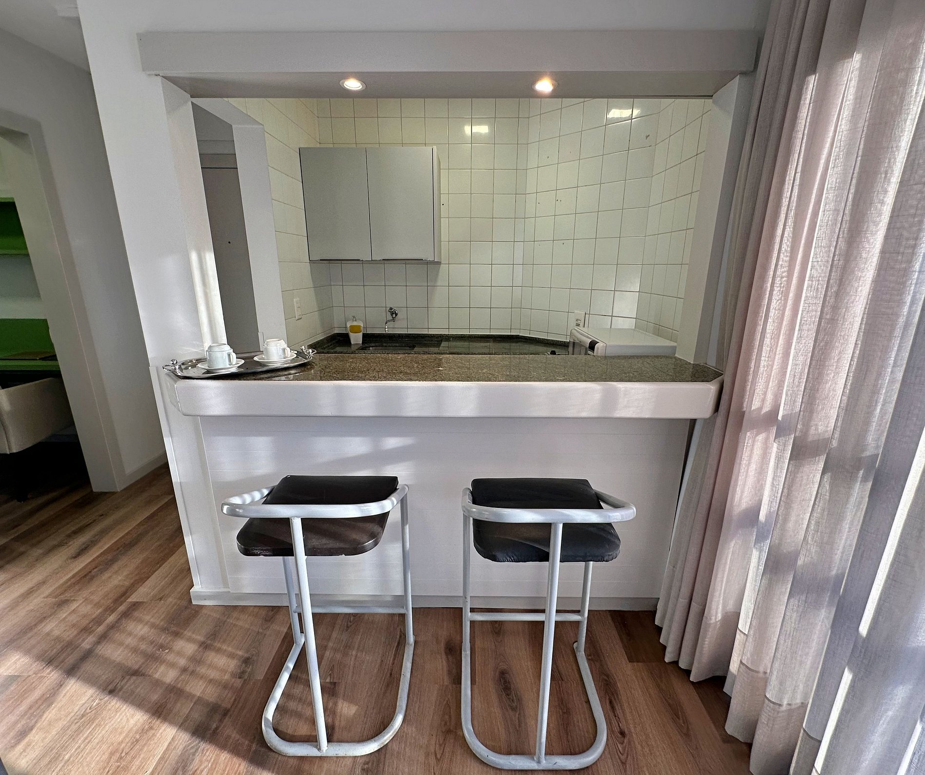 Apartamento possui cozinha de flat equipada com fogão elétrico 2 bocas, frigobar, micro-ondas e pia. Também tem a disposição utensílios de cozinha.