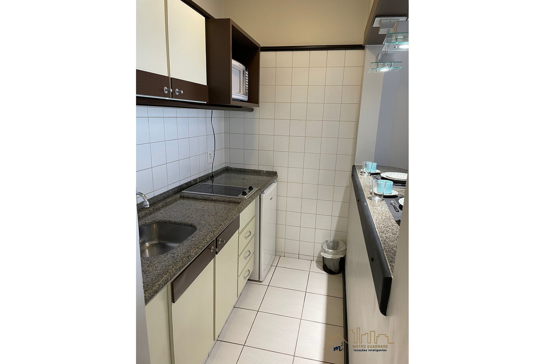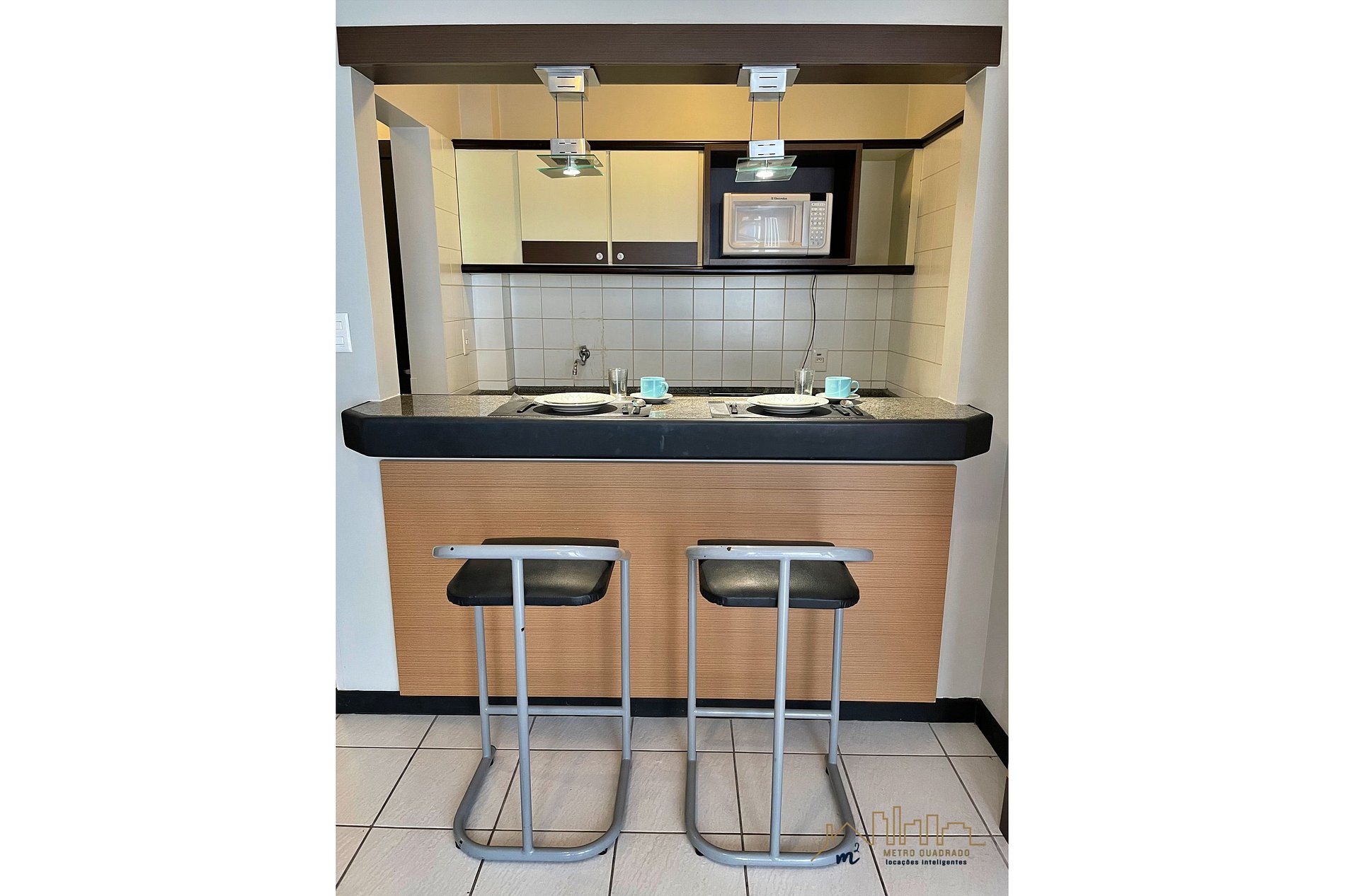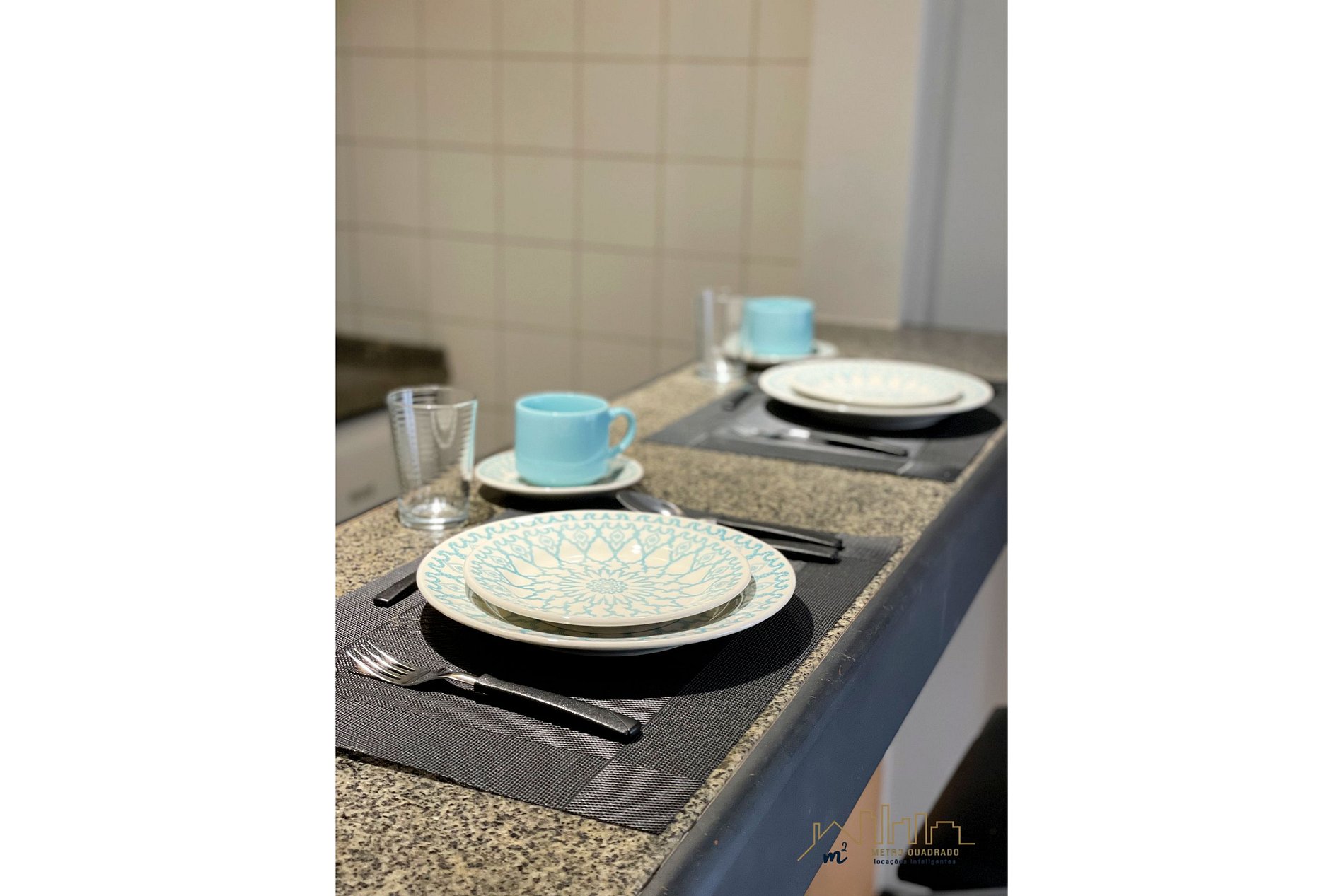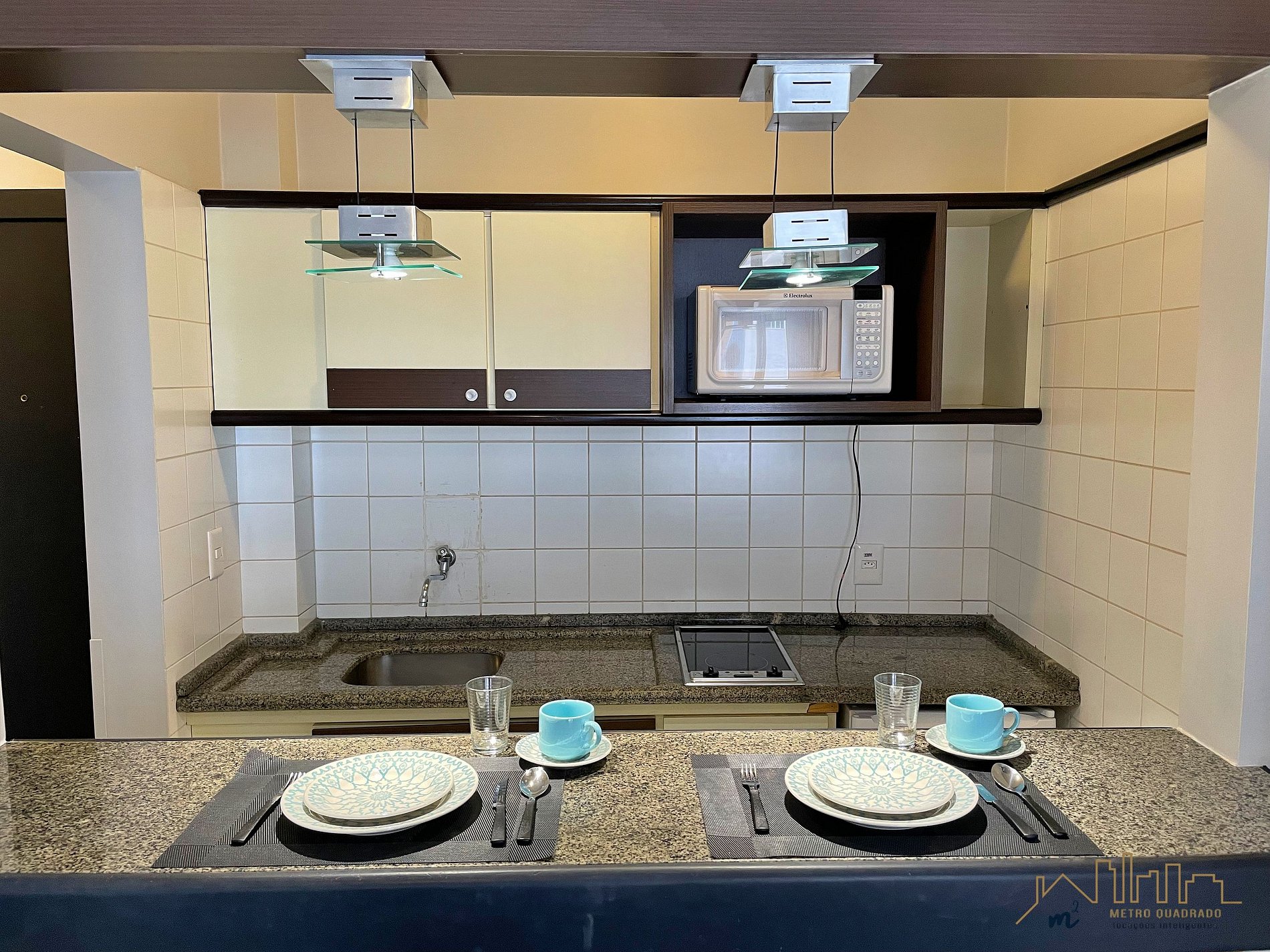 Apartamento possui cozinha de flat equipada com fogão elétrico 2 bocas, frigobar, micro-ondas e pia. Também tem a disposição pratos, talheres, copos, xícaras, panela, frigideira e leiteira.