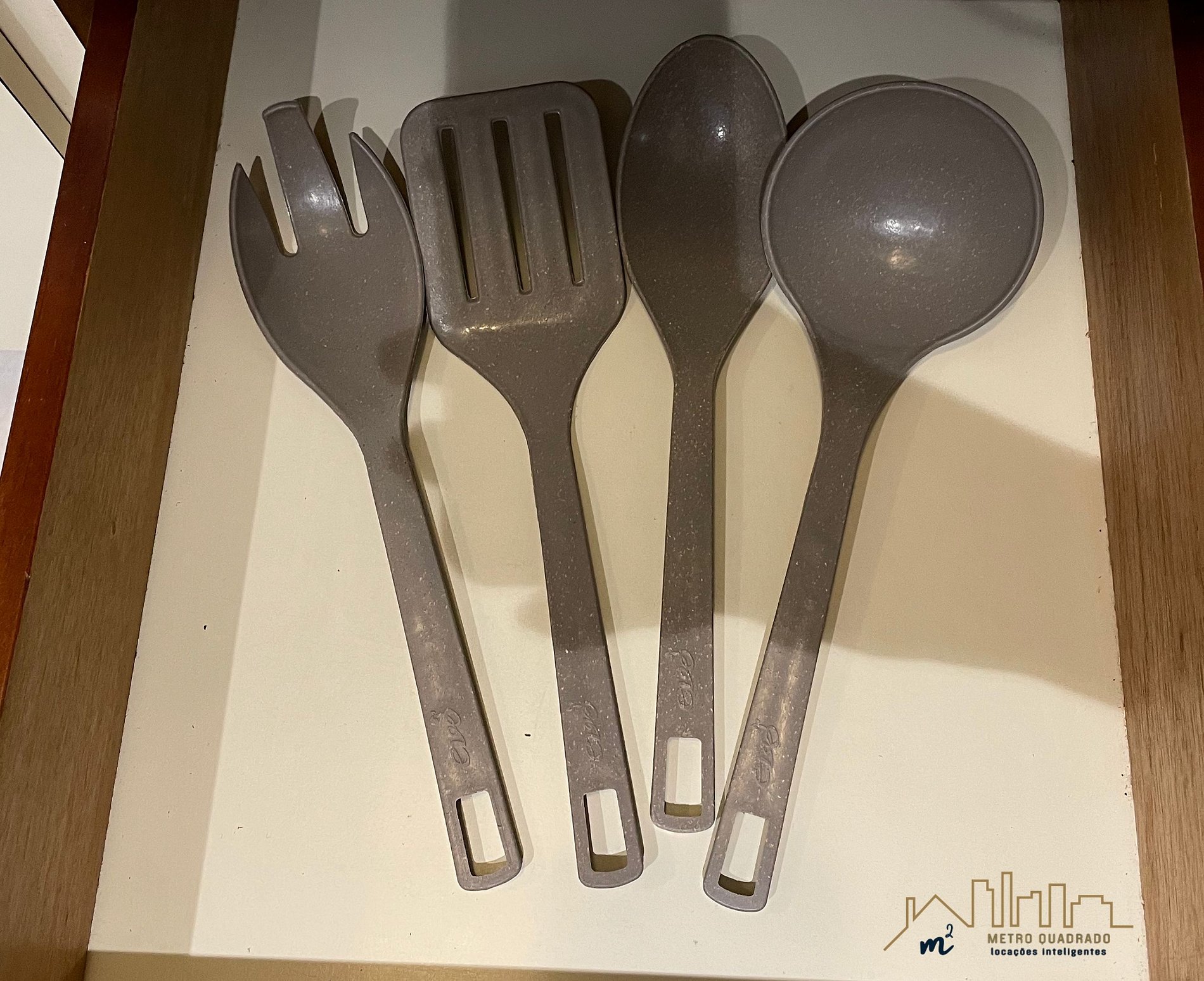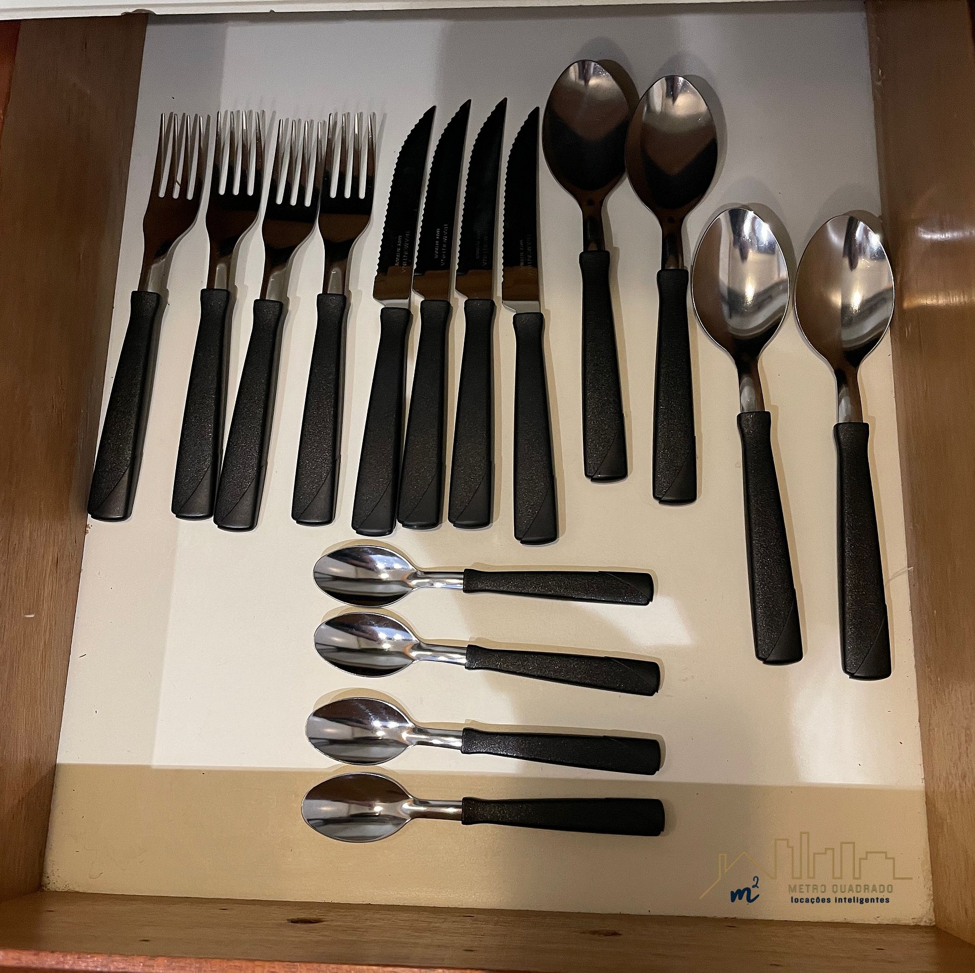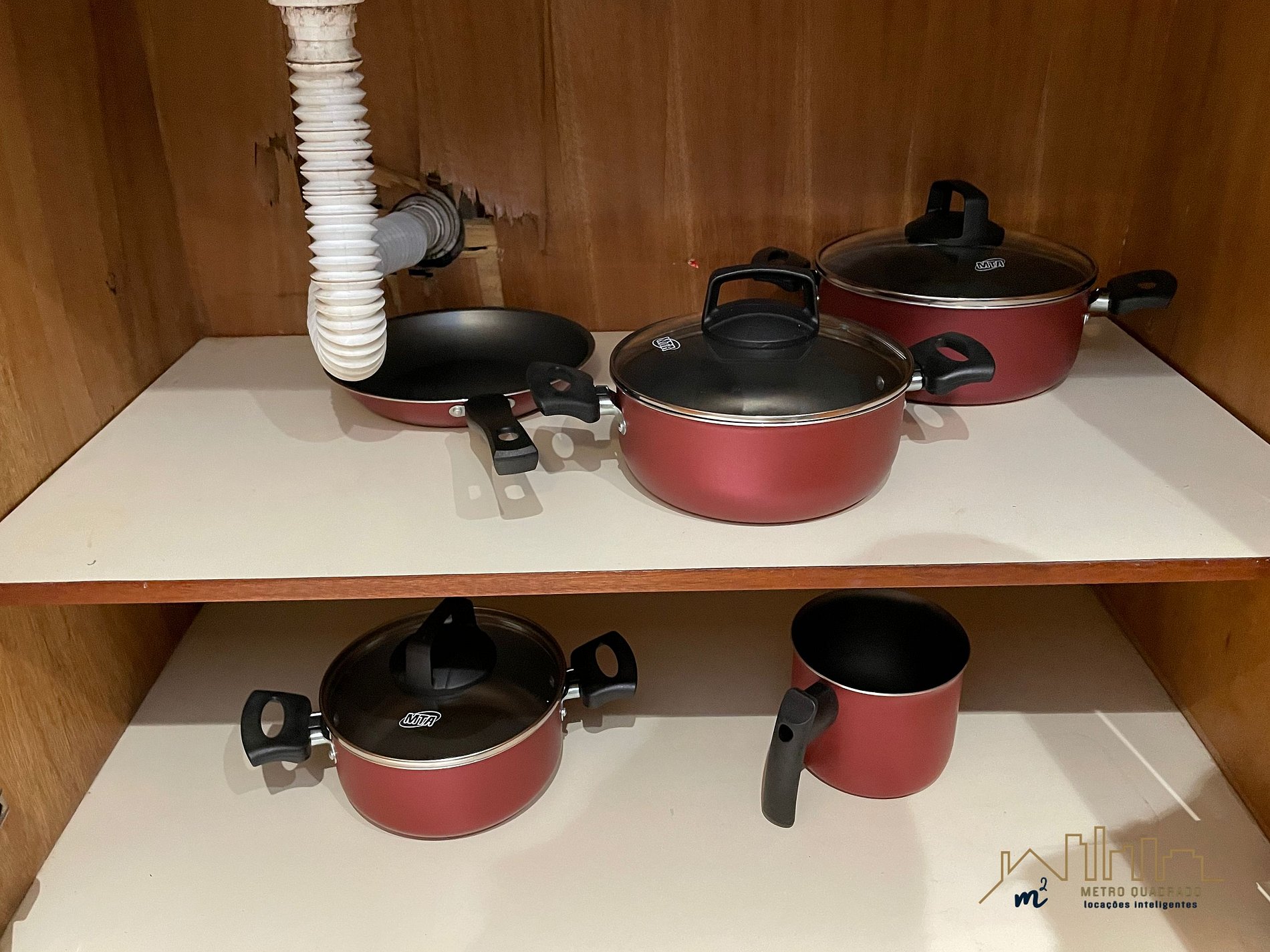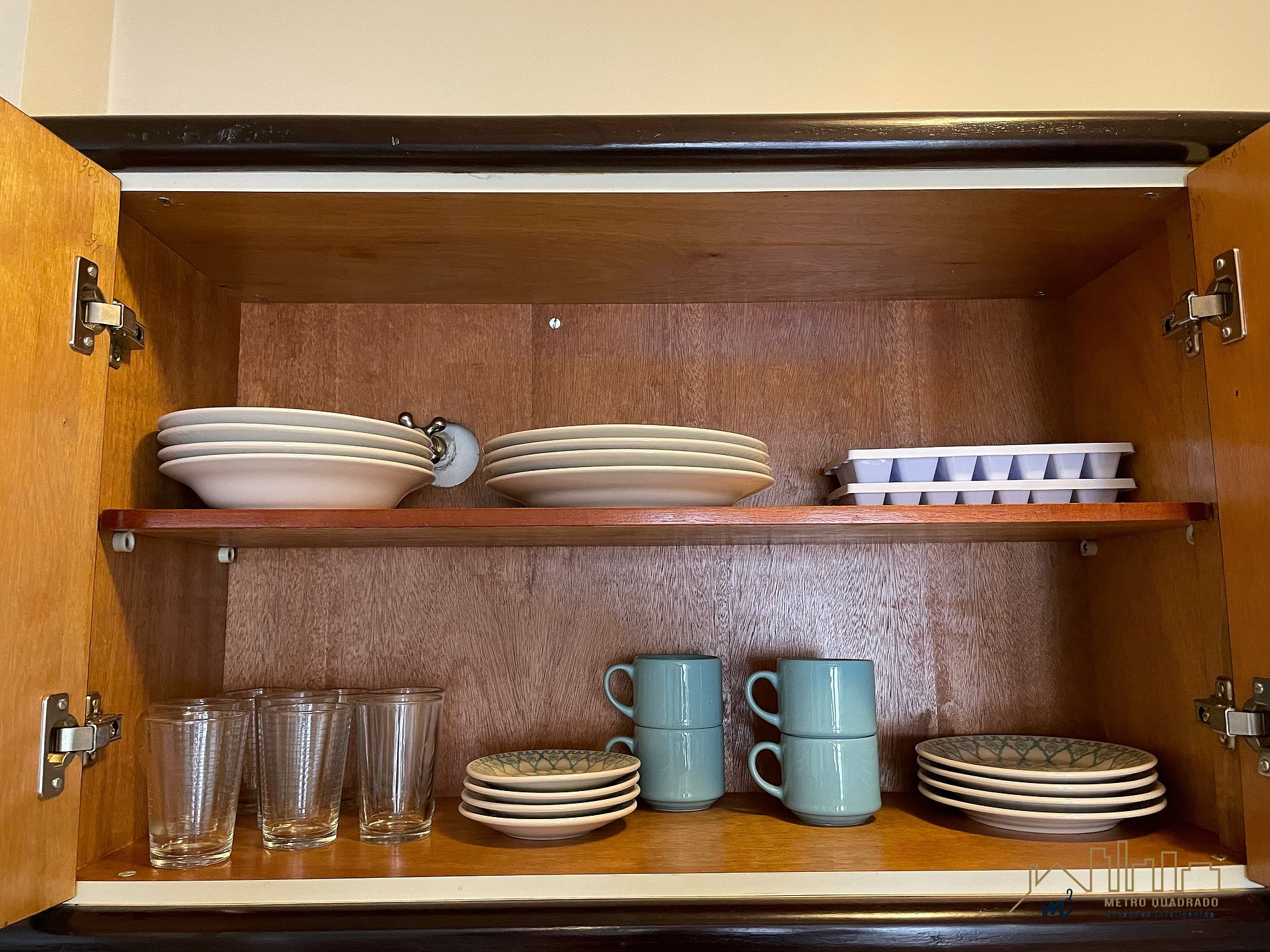 Apartamento possui cozinha de flat equipada com fogão elétrico 2 bocas, frigobar, micro-ondas e pia. Também tem a disposição pratos, talheres, copos, xícaras, panela, frigideira e leiteira.