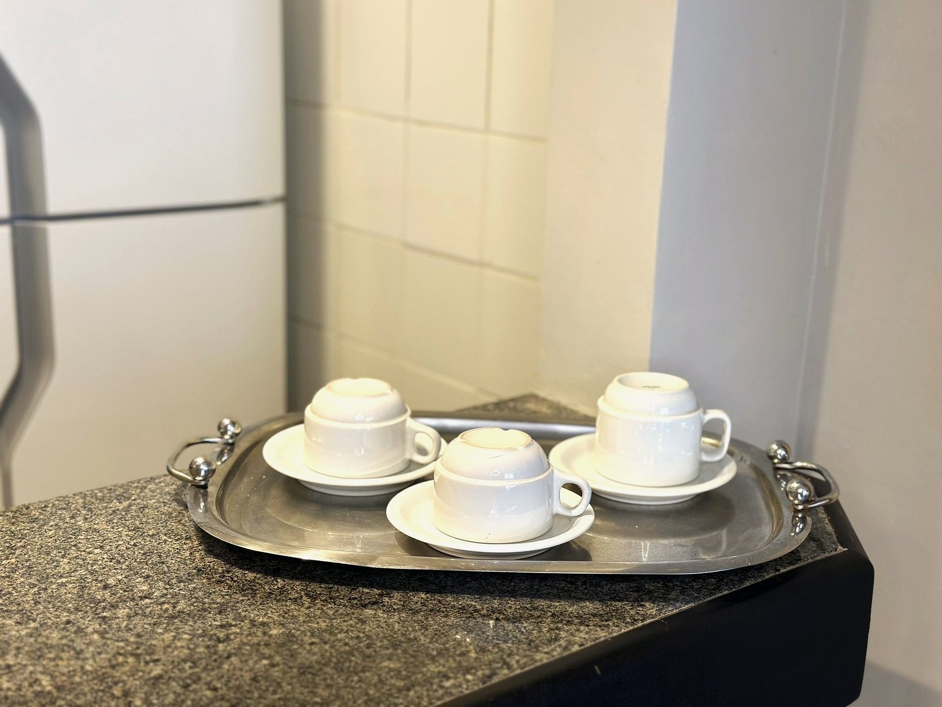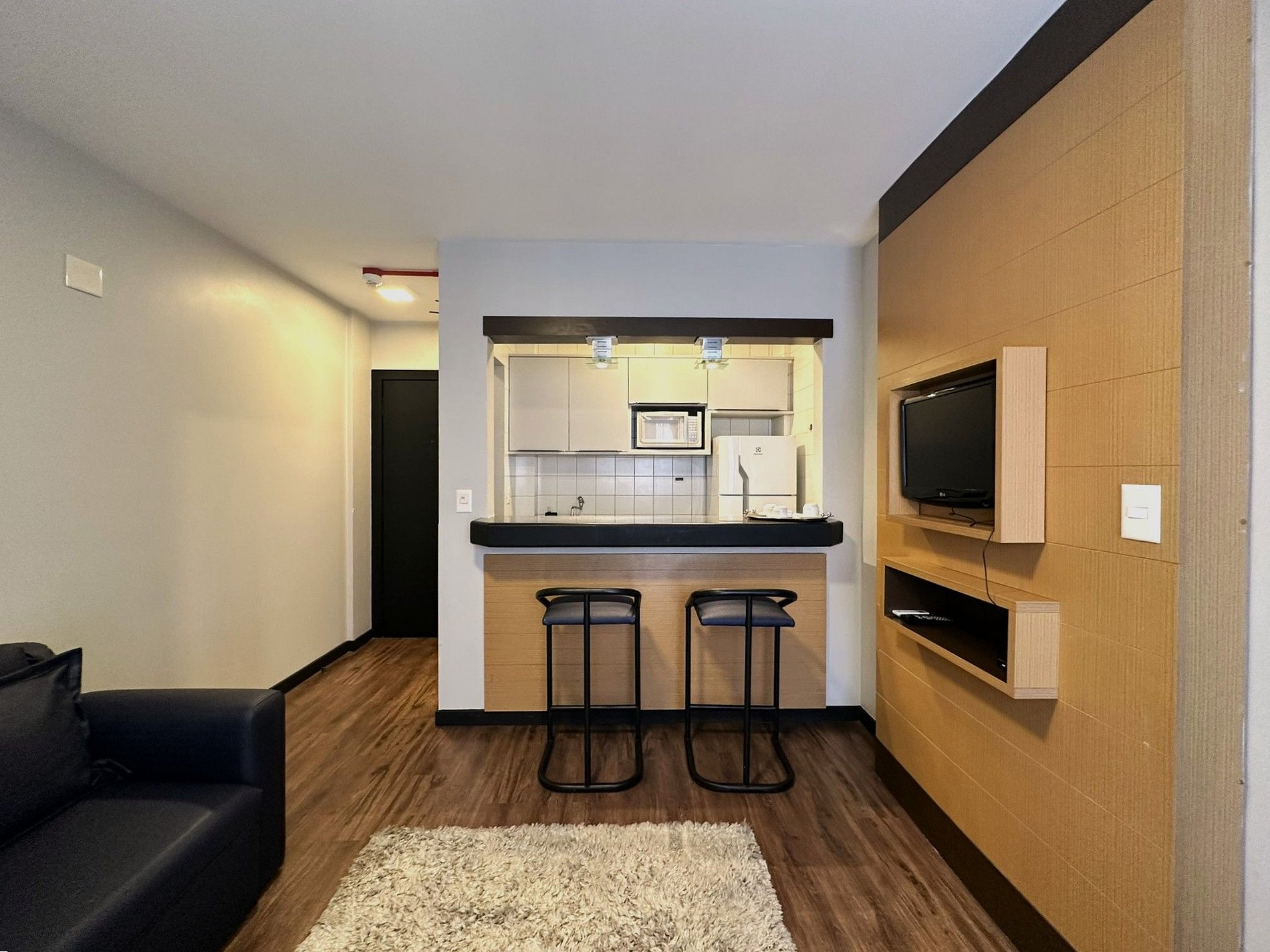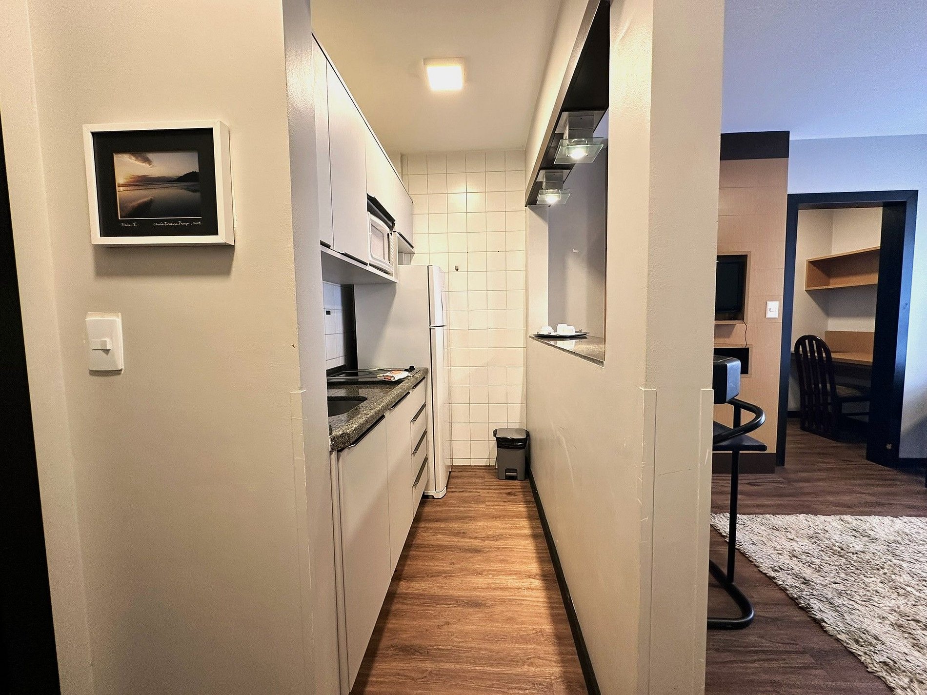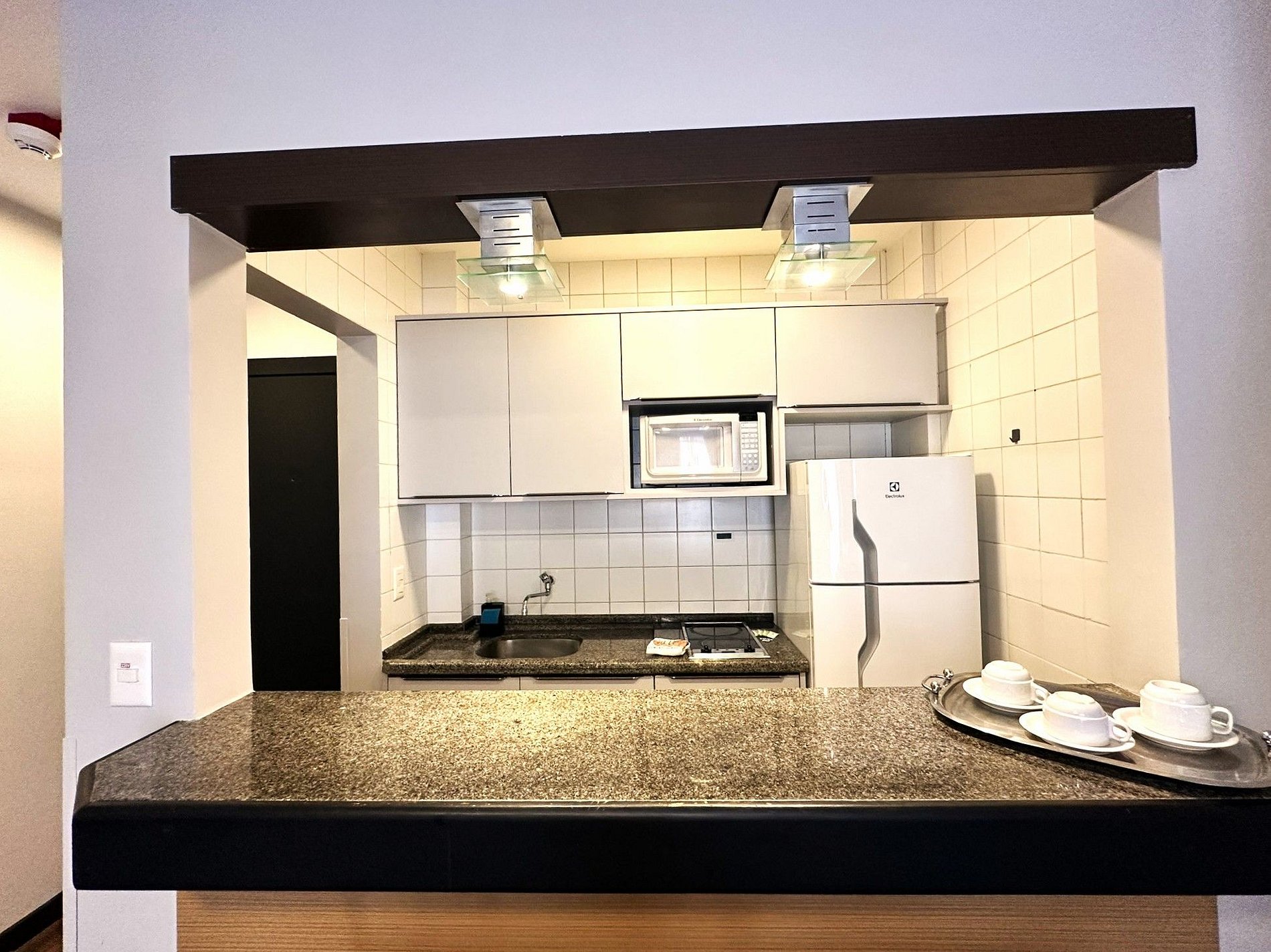 Apartamento possui cozinha de flat equipada com fogão elétrico 2 bocas, frigobar, micro-ondas e pia. Também tem a disposição pratos, talheres, copos, xícaras, panela, frigideira, leiteira e cafeteira.