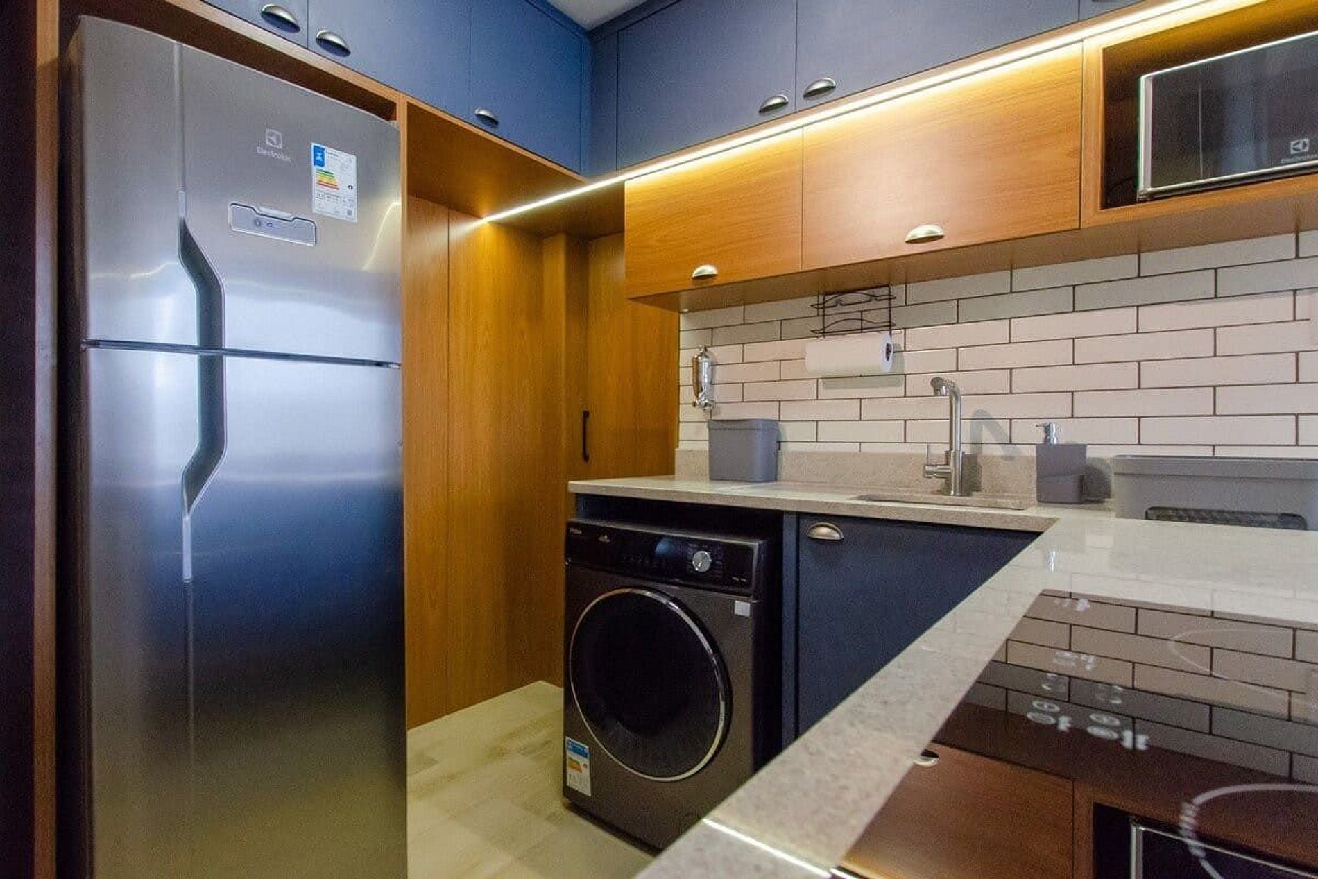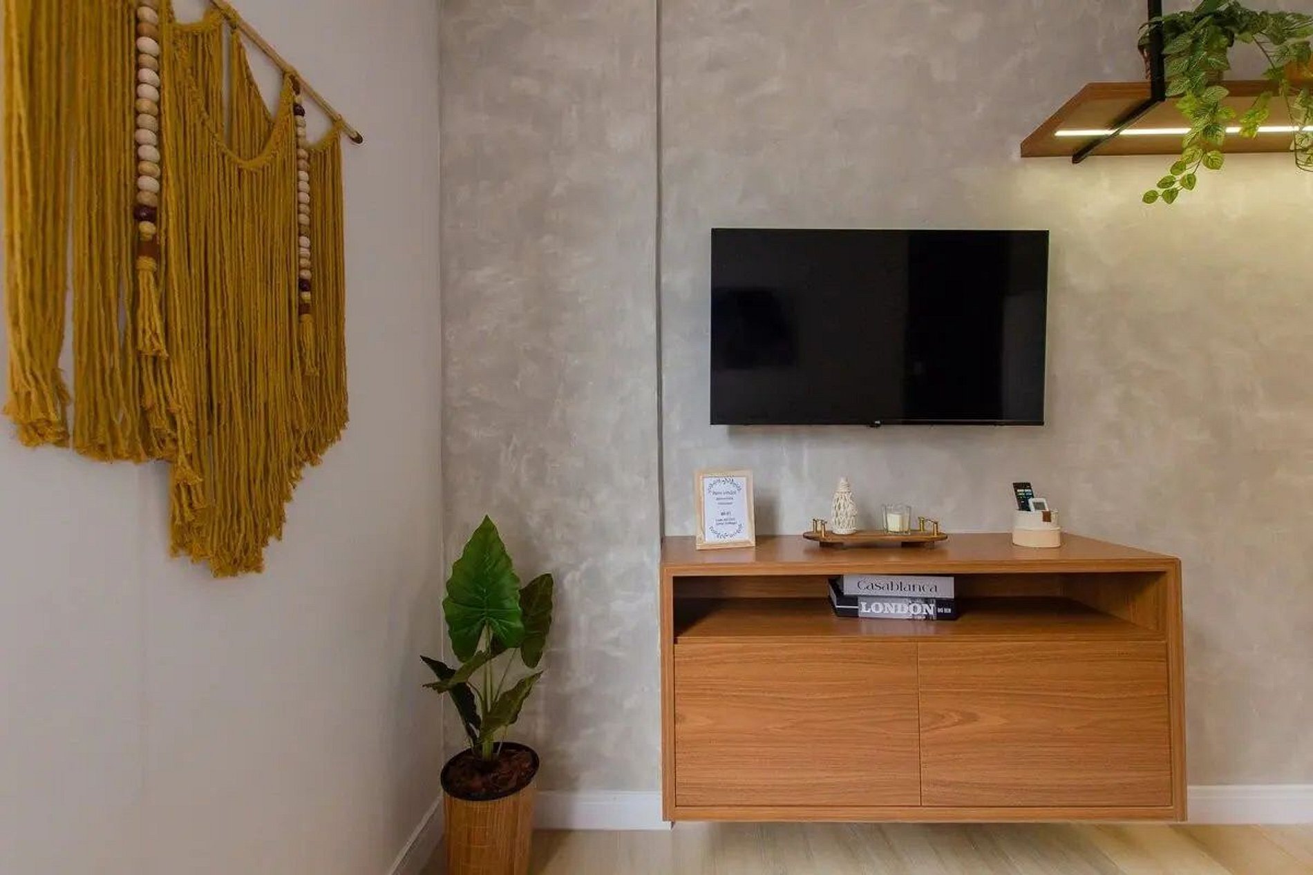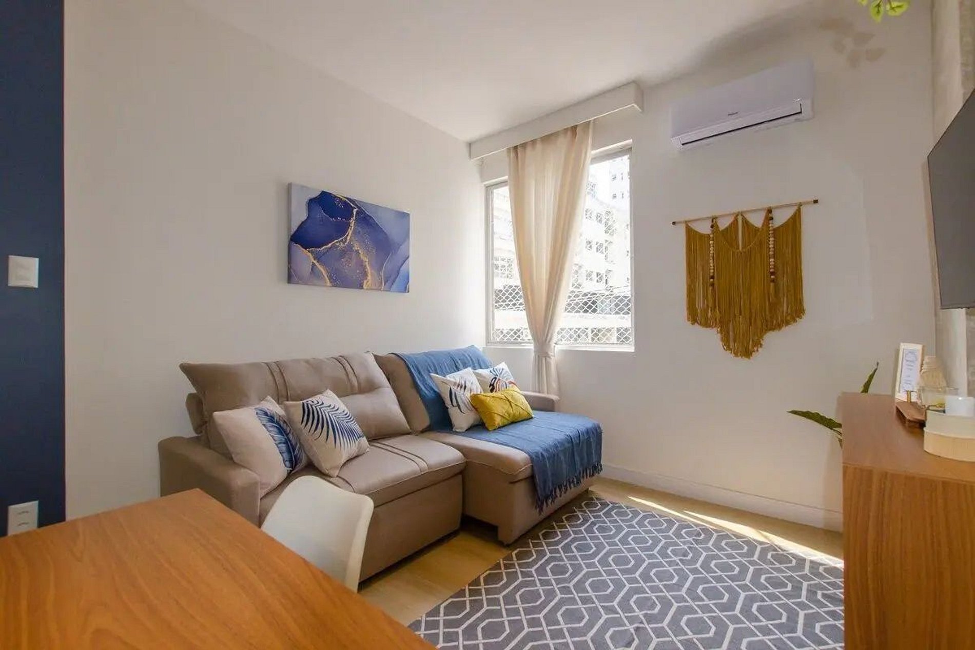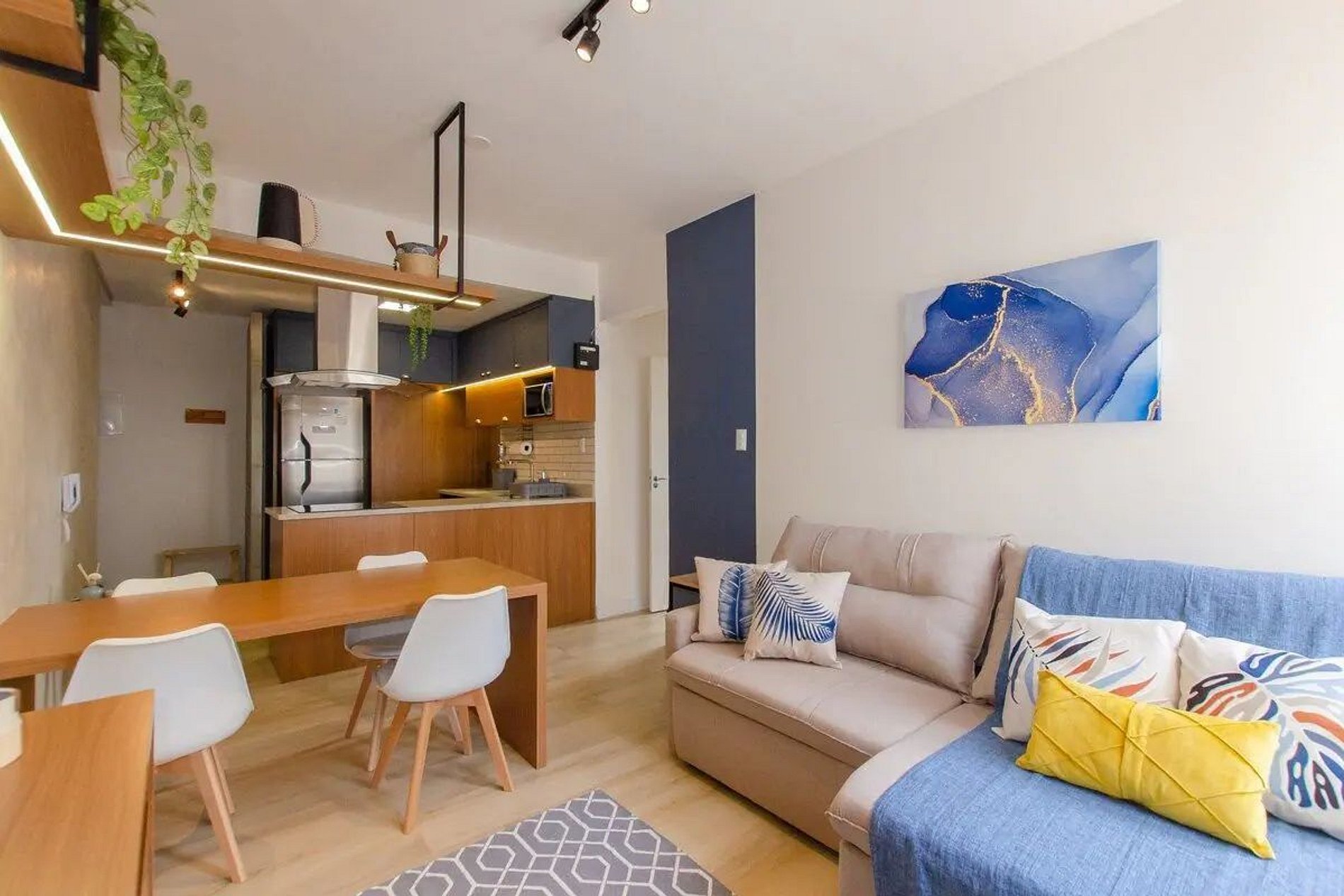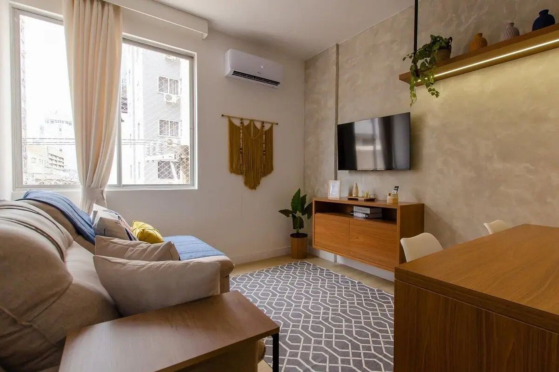 Completo com 2 quartos, um de casal e um de solteiro, escritório para home office, cozinha completa com máquina de lava e seca e sala de jantar e tv super aconchegante.