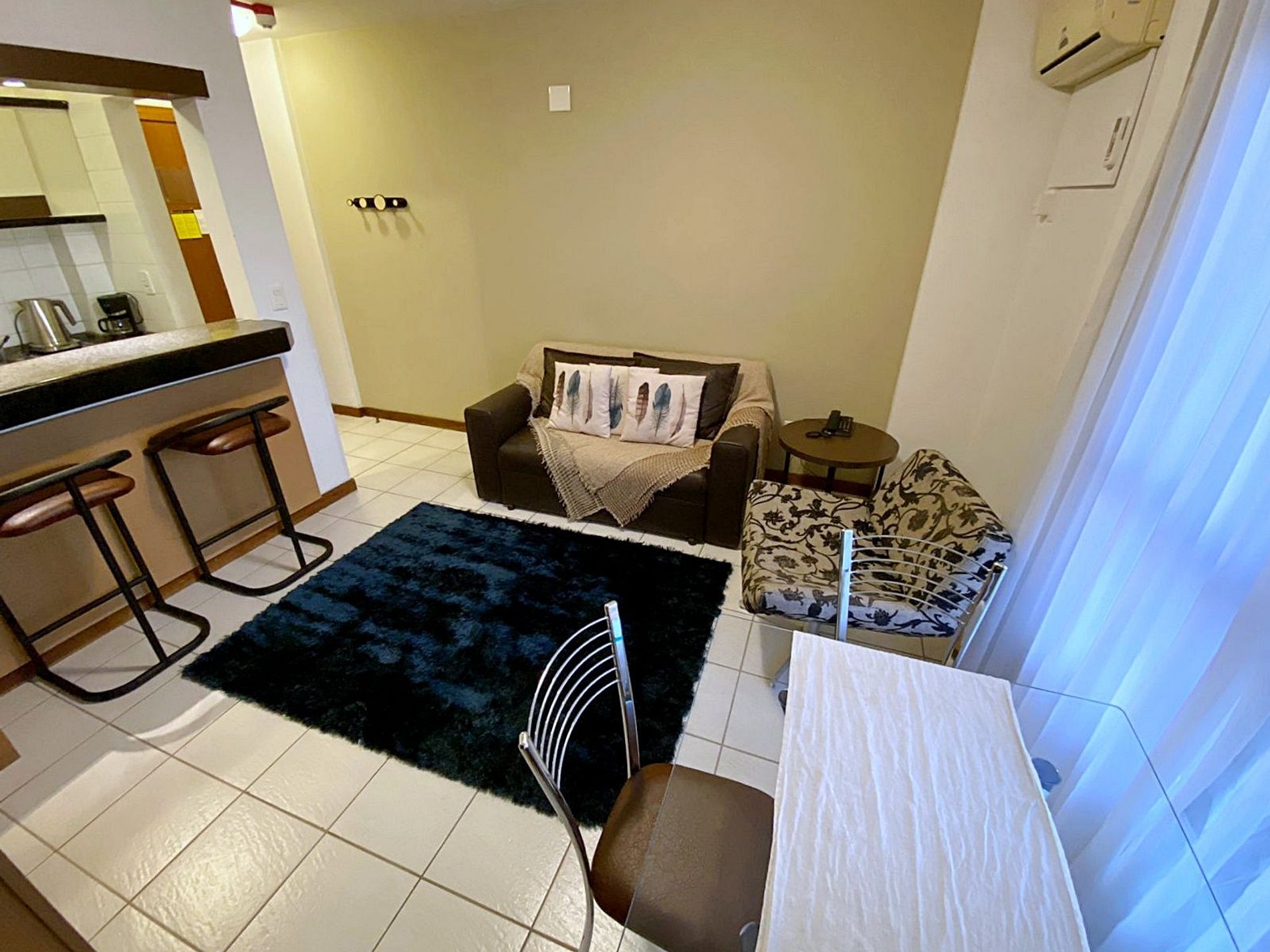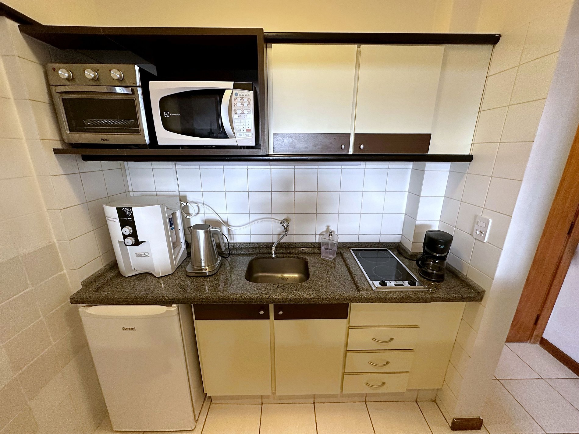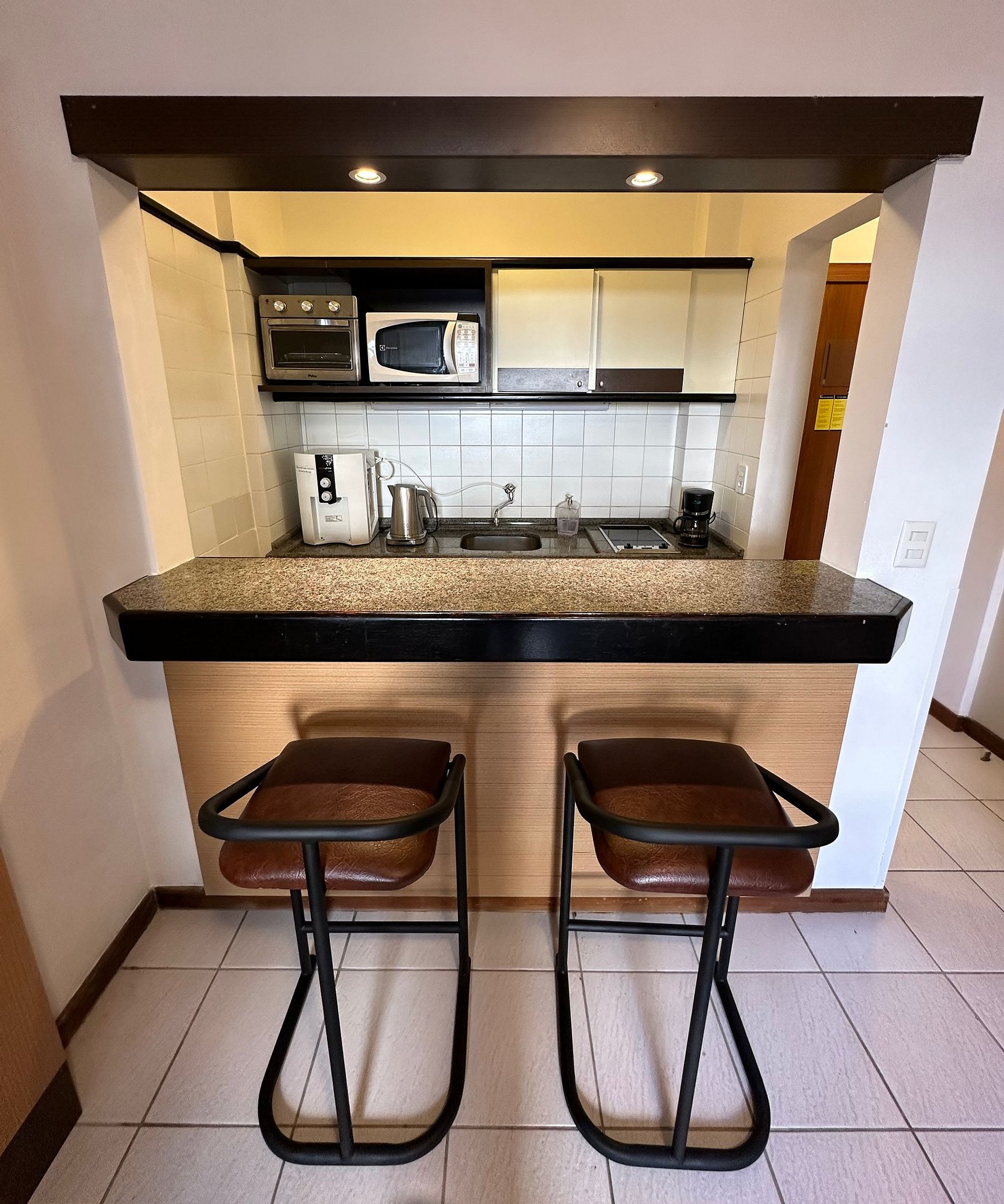 Apartamento possui cozinha de flat equipada com fogão elétrico 2 bocas, forno/airfryer, chaleira elétrica, purificador de água, frigobar, micro-ondas, cafeteira e pia. Também tem a disposição pratos, talheres, copos, xícaras, panela, frigideira e leiteira.