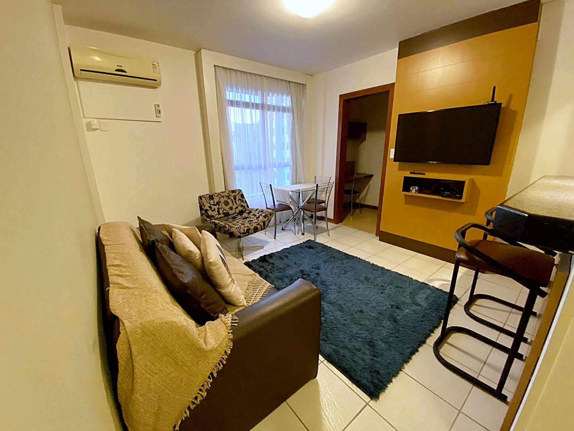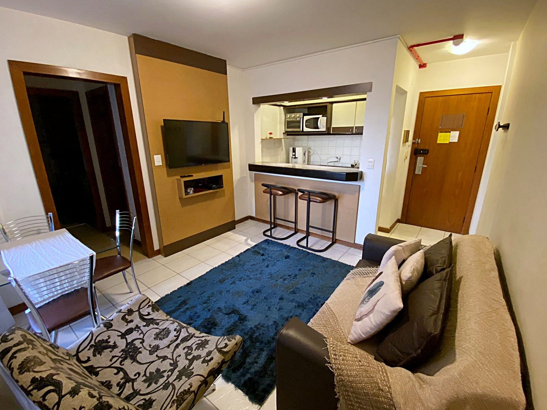 Dispõe de 1 quarto, sala, cozinha, espaço para utilização de laptop e banheiro. O quarto pode ser arrumado com 1 cama de casal ou 2 camas de solteiro. O sofá-cama da sala é confortável e acomoda 1 pessoa.