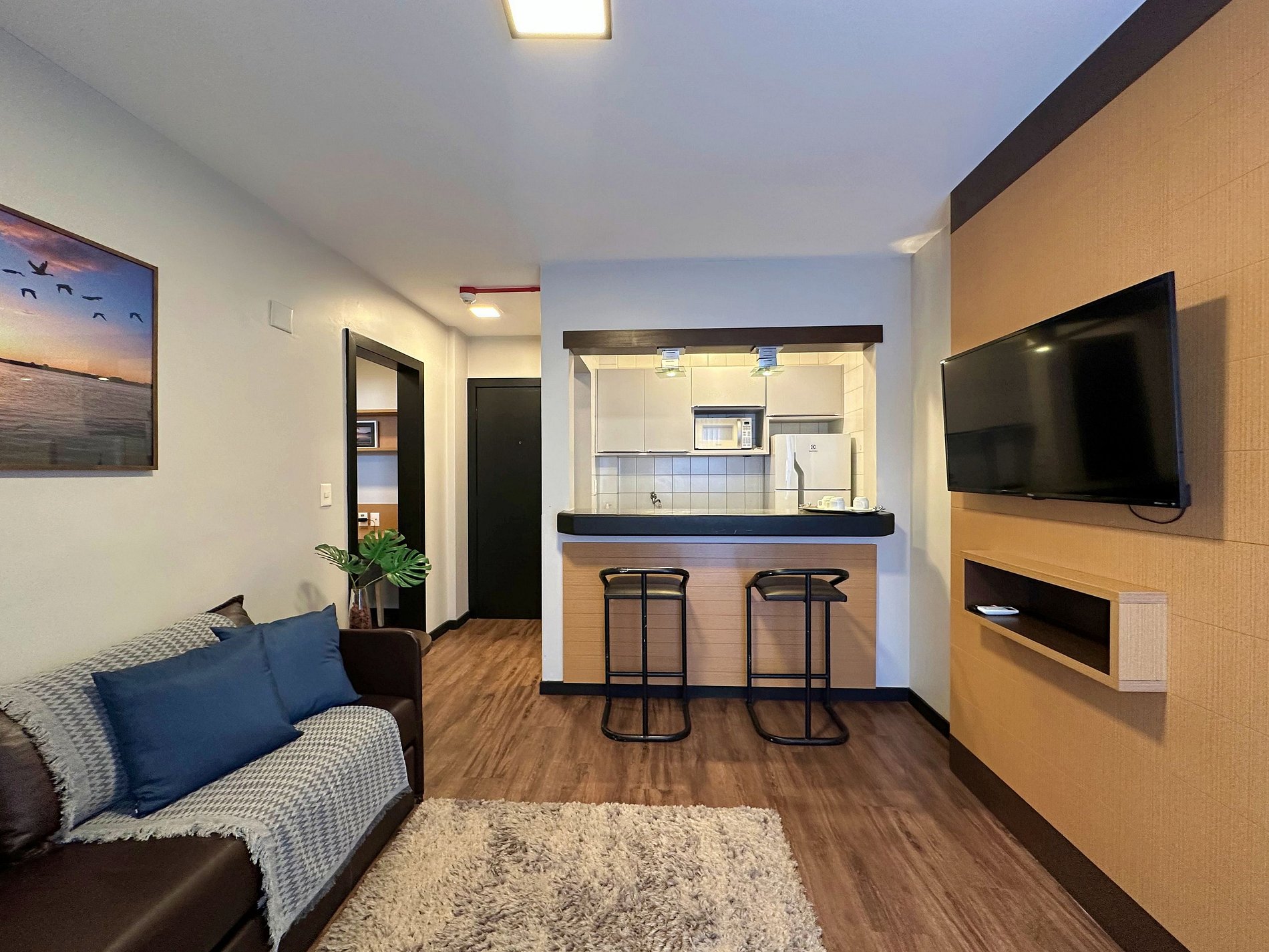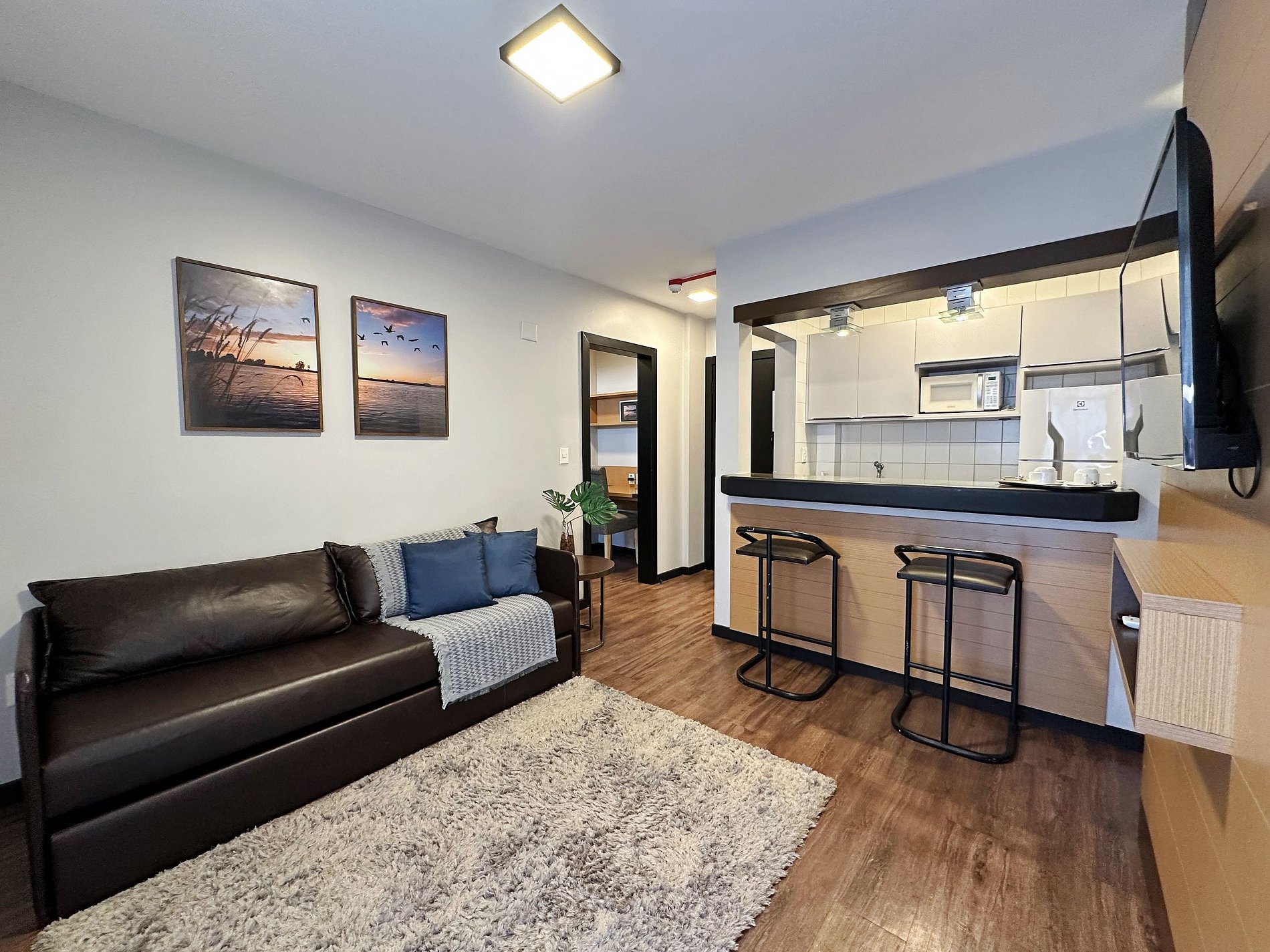 Dispõe de 1 quarto com cama Queen, sala, cozinha, espaço para utilização de laptop e banheiro. O sofá-cama da sala é confortável e acomoda até 2 pessoas.