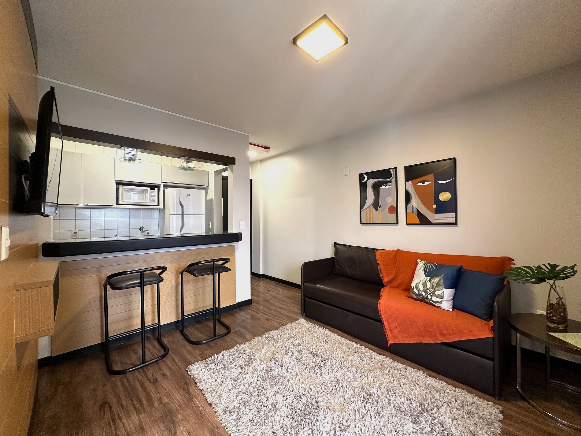 Dispõe de 1 quarto, sala, cozinha, espaço para utilização de laptop e banheiro. O quarto pode ser arrumado com 1 cama de casal ou 2 camas de solteiro. O sofá-cama da sala é confortável e acomoda 1 pessoa.