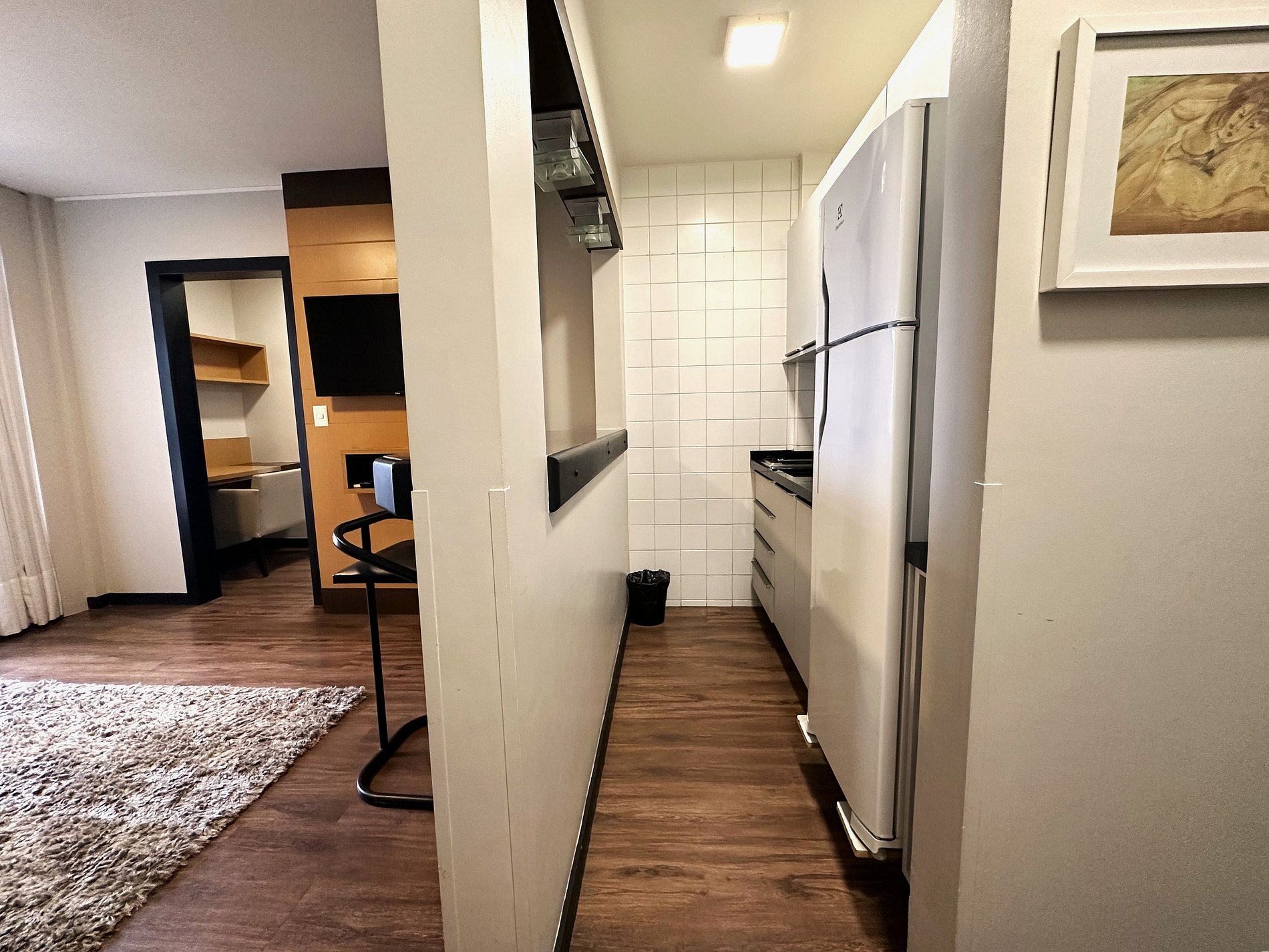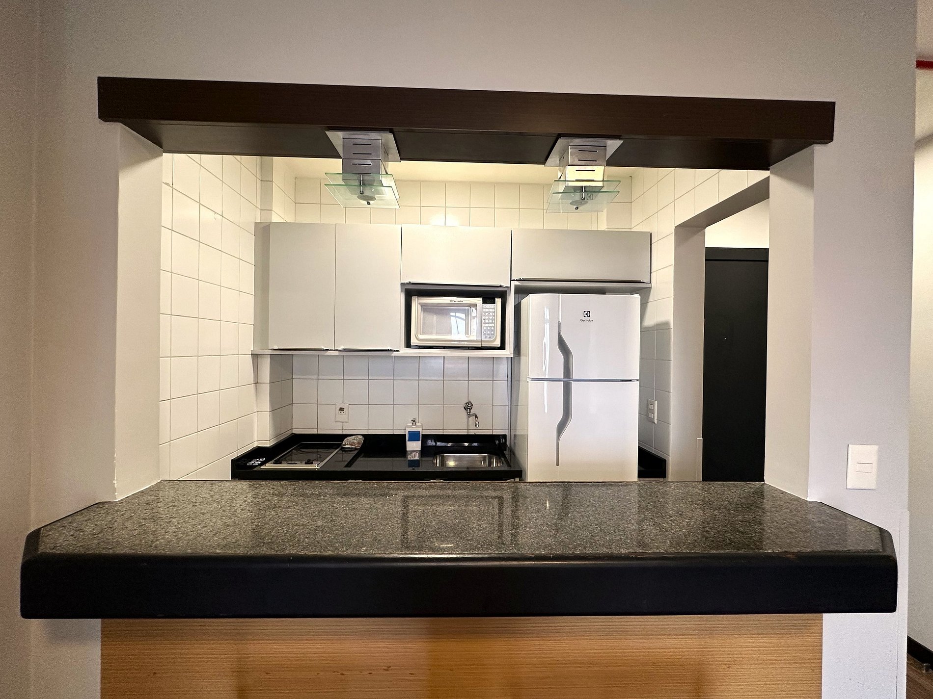 Apartamento possui cozinha de flat equipada com fogão elétrico 2 bocas, frigobar, micro-ondas e pia. Também tem a disposição pratos, talheres, copos, xícaras, panela, frigideira e leiteira.
