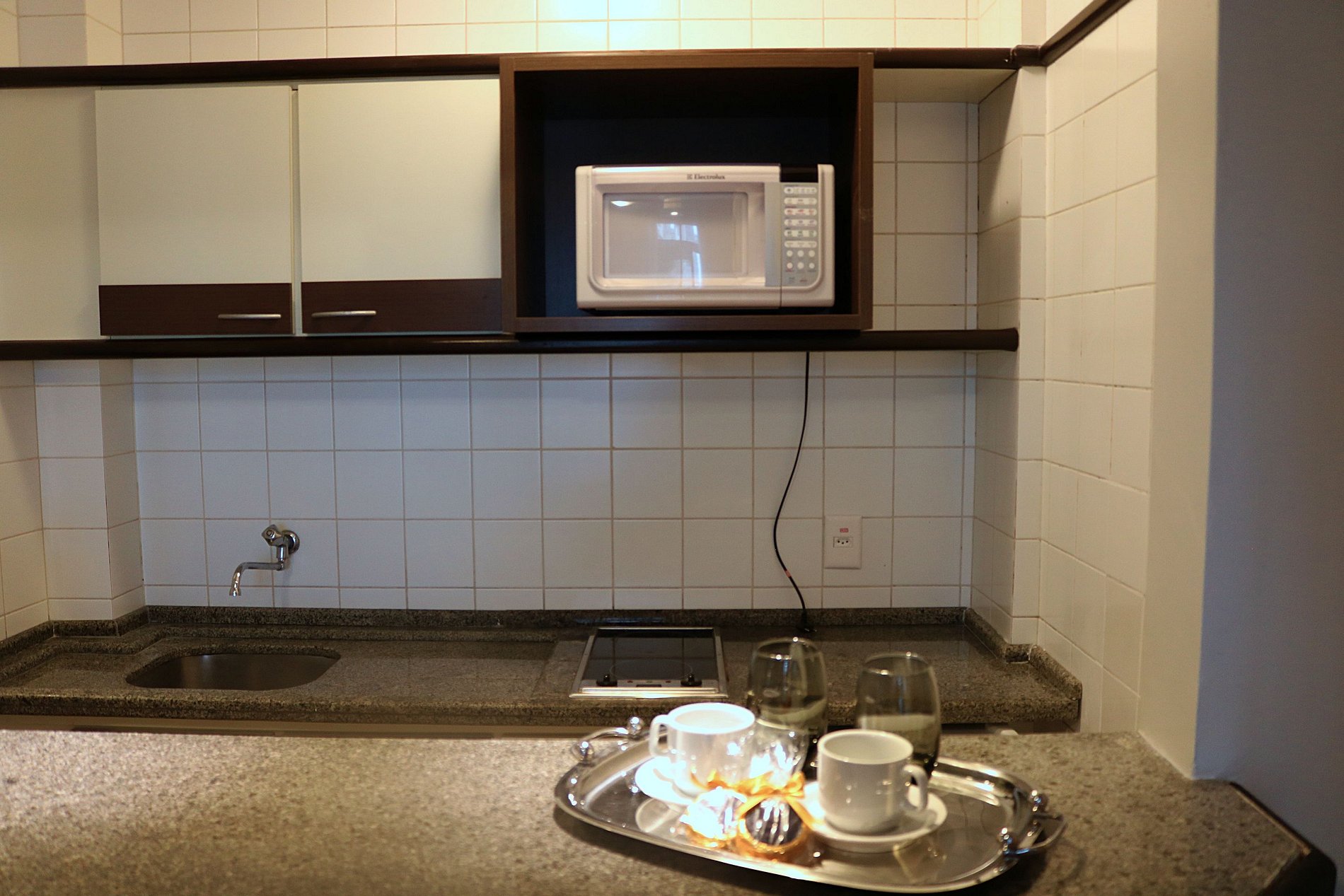 Apartamento possui cozinha de flat equipada com fogão elétrico 2 bocas, frigobar, micro-ondas e pia. Também tem a disposição pratos, talheres, copos, xícaras, panela, frigideira e leiteira.