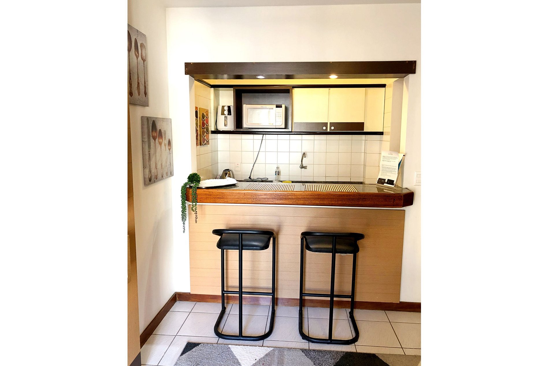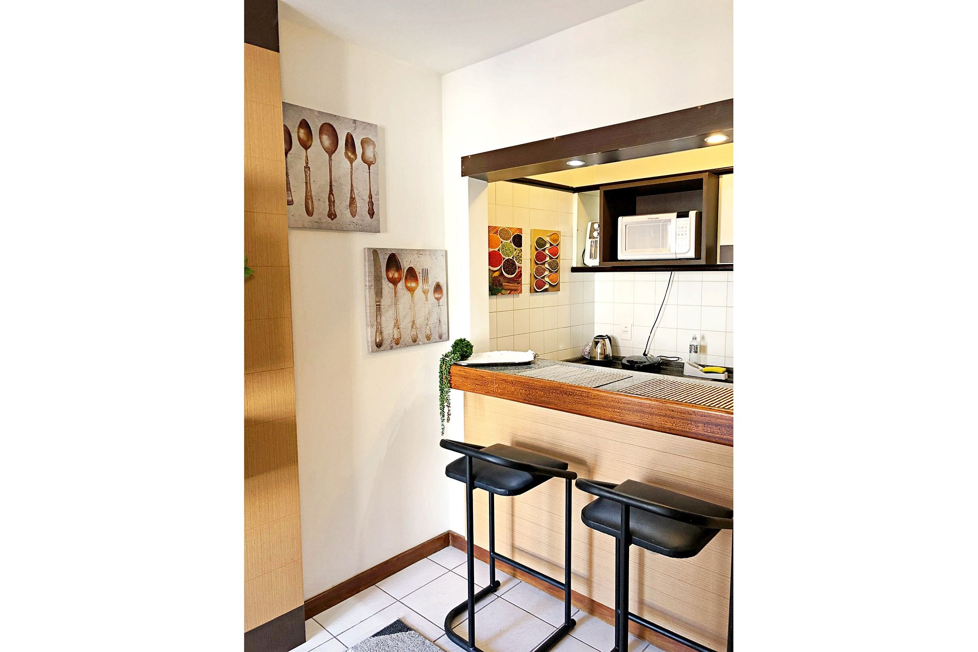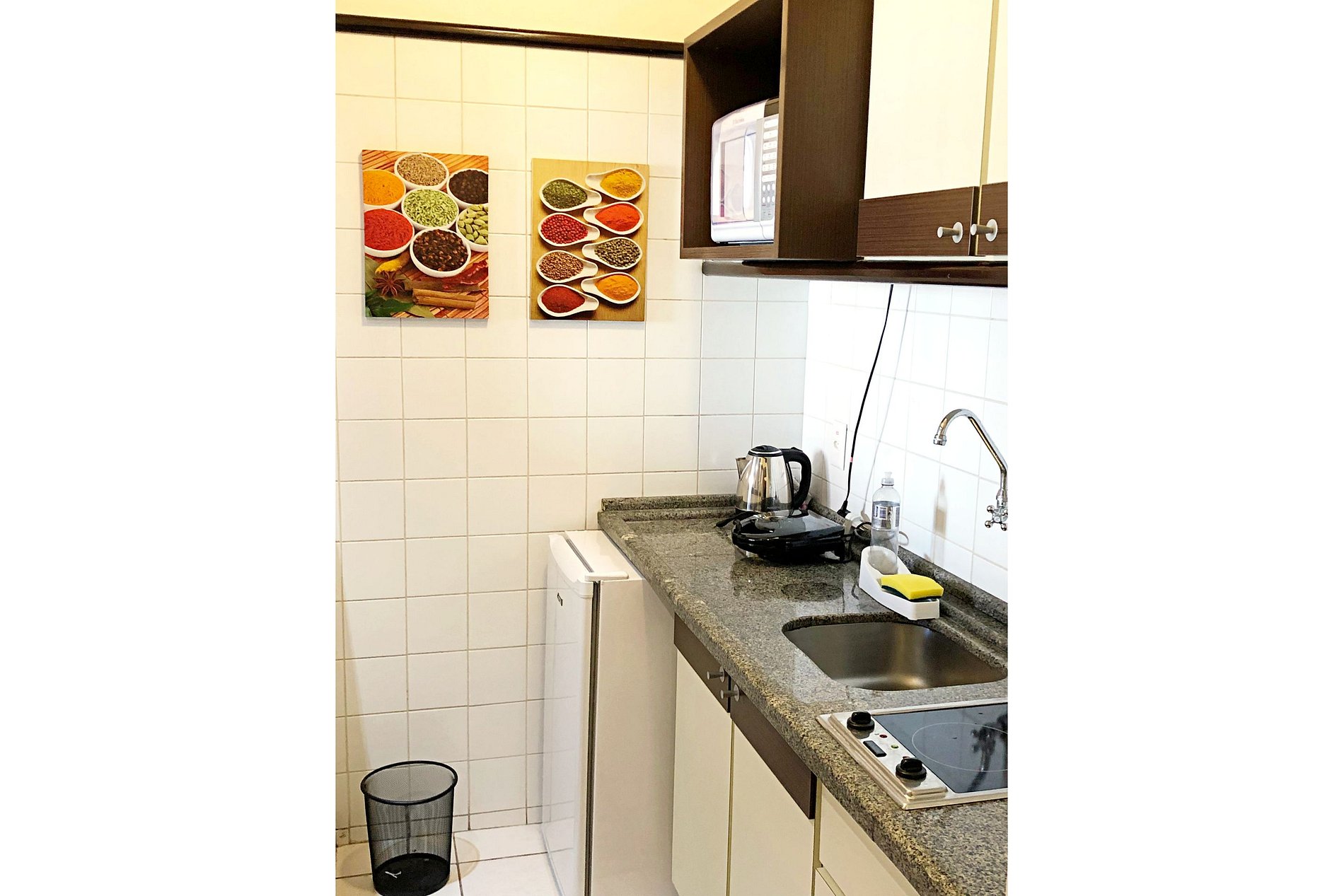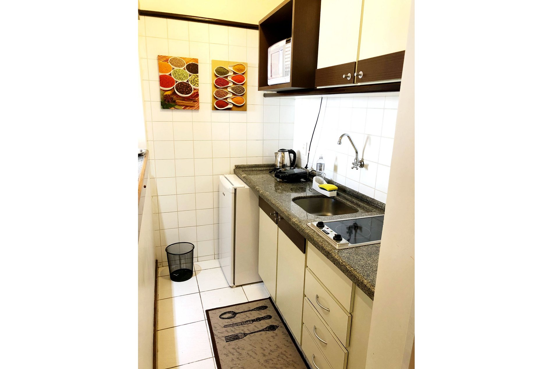 O apartamento dispõe de cozinha equipada com fogão elétrico de 2 bocas, frigobar, micro-ondas e pia. Utensílios de cozinha também estão disponíveis.