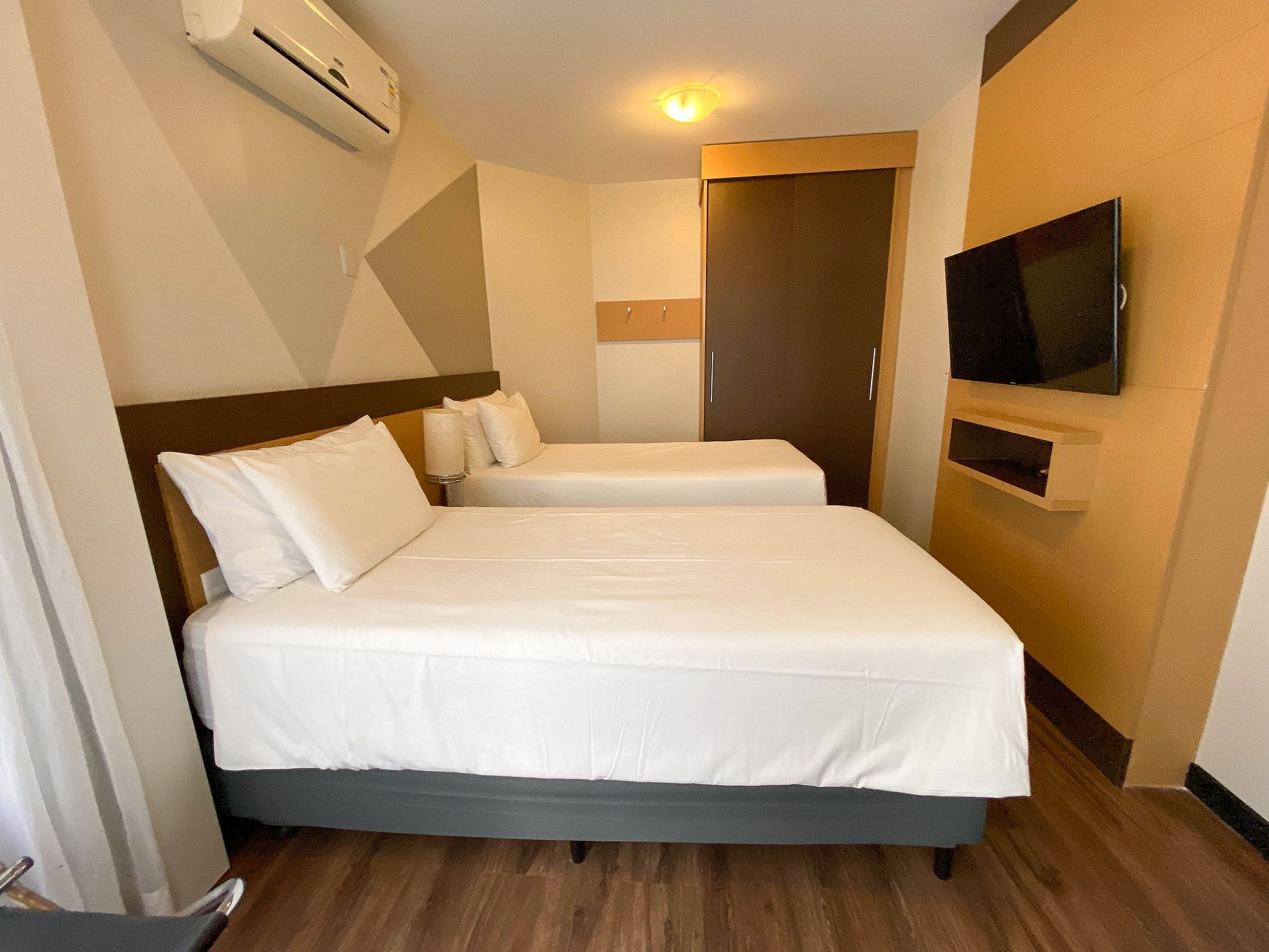 Dispõe de 1 quarto, sala, cozinha, espaço para utilização de laptop e banheiro. O quarto pode ser arrumado com 1 cama de casal ou 2 camas de solteiro.