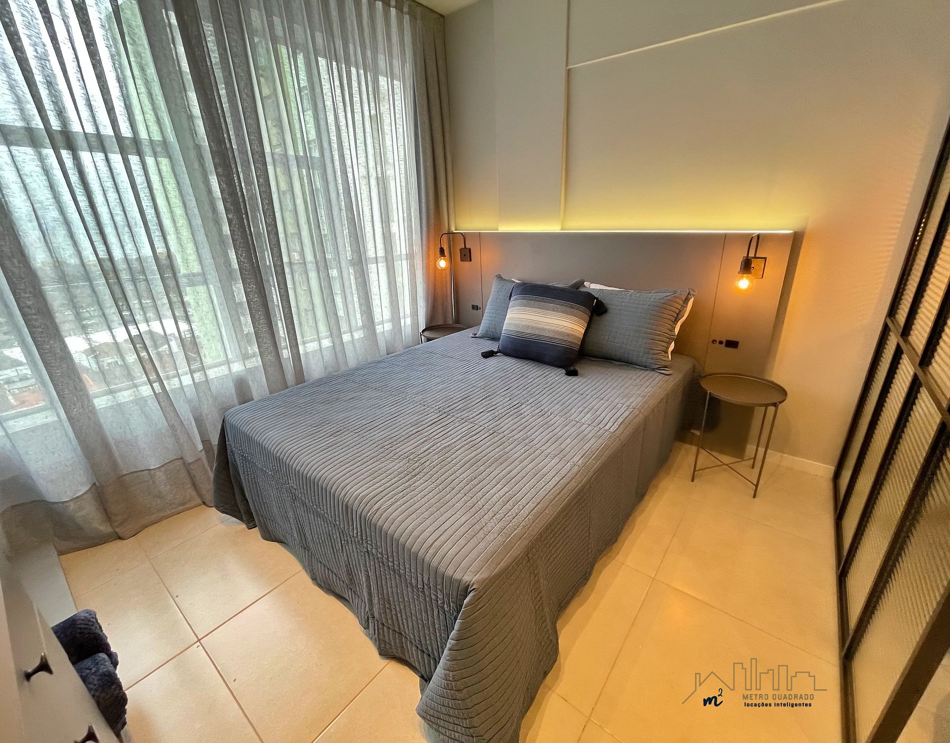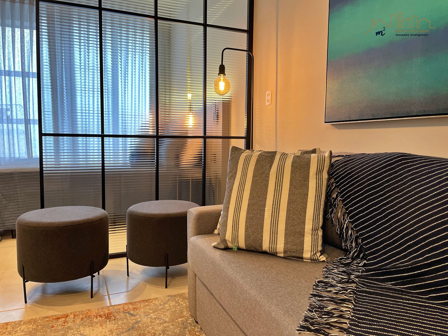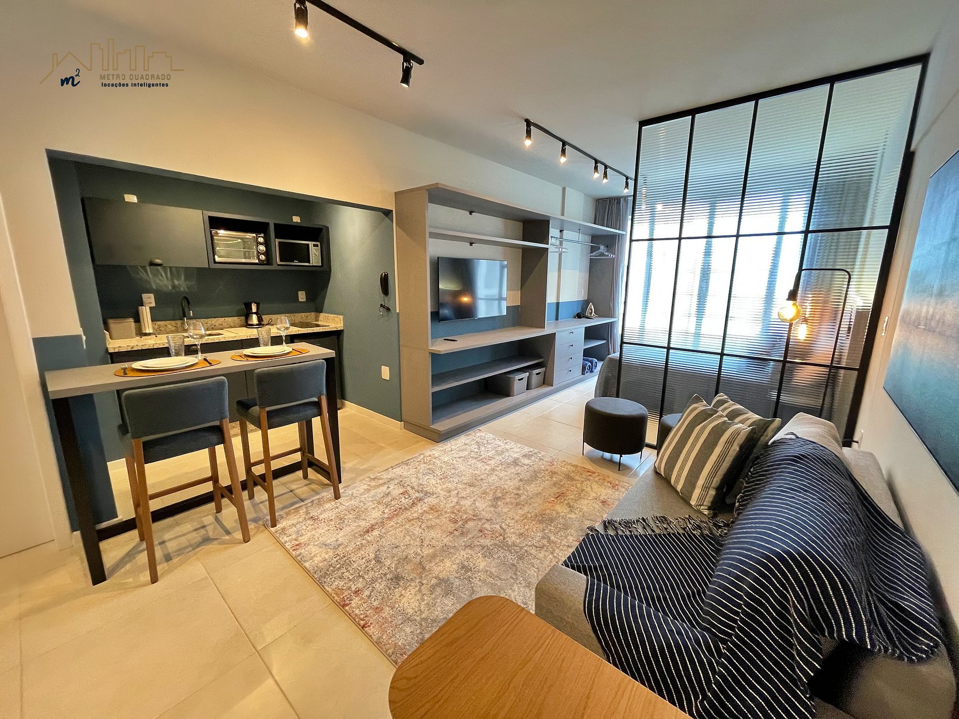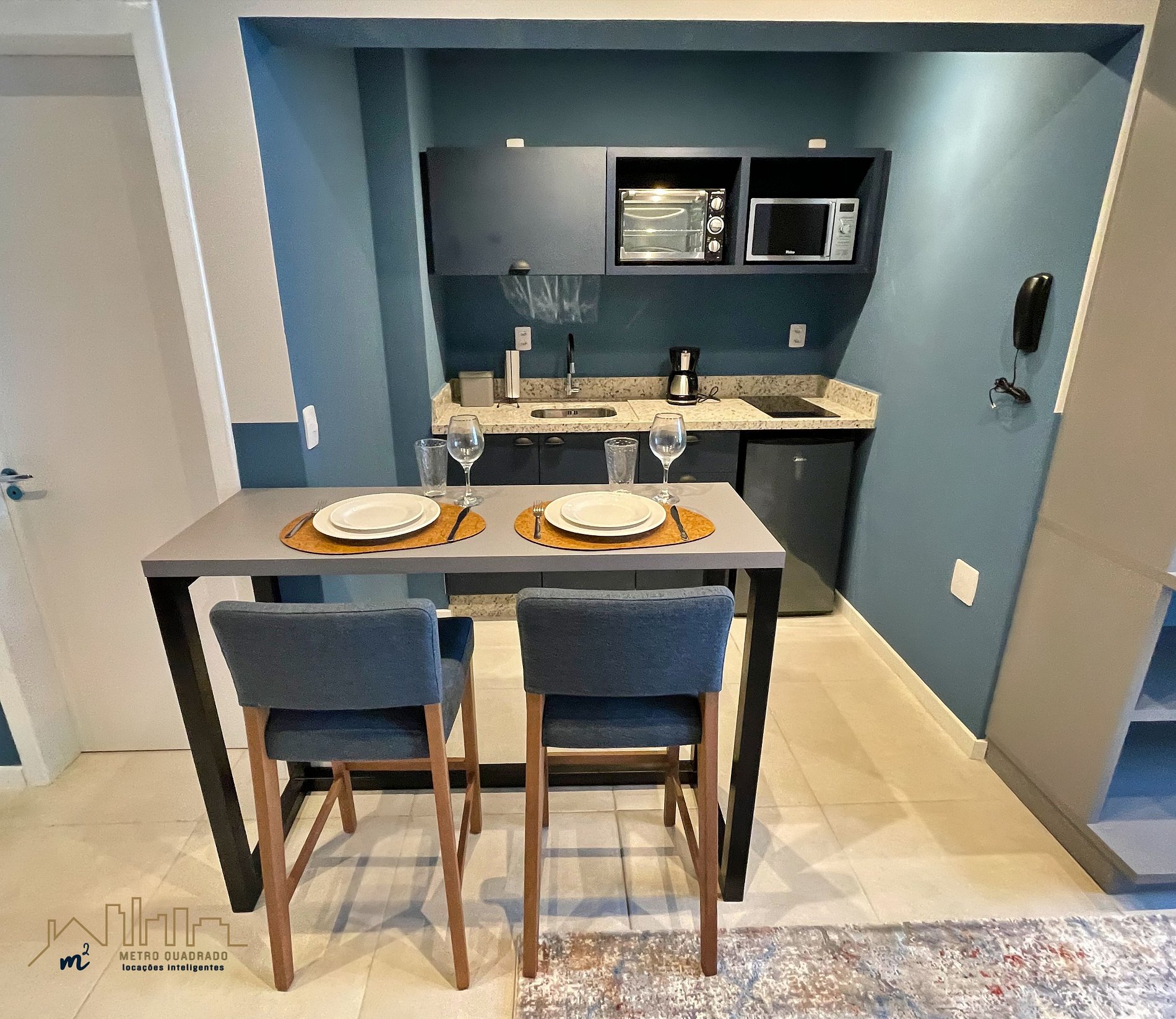 Os 38m² contam com cozinha compacta com copos, pratos, talheres, taças, panelas, cafeteira, liquidificador, microondas, forno elétrico, frigobar e cooktop por indução. Quarto com cama queen, armário com arara e cabides, sala com sofá-cama, tv smart, mesa de jantar e bancada. Possui Wi-fi próprio e ar-condicionado.