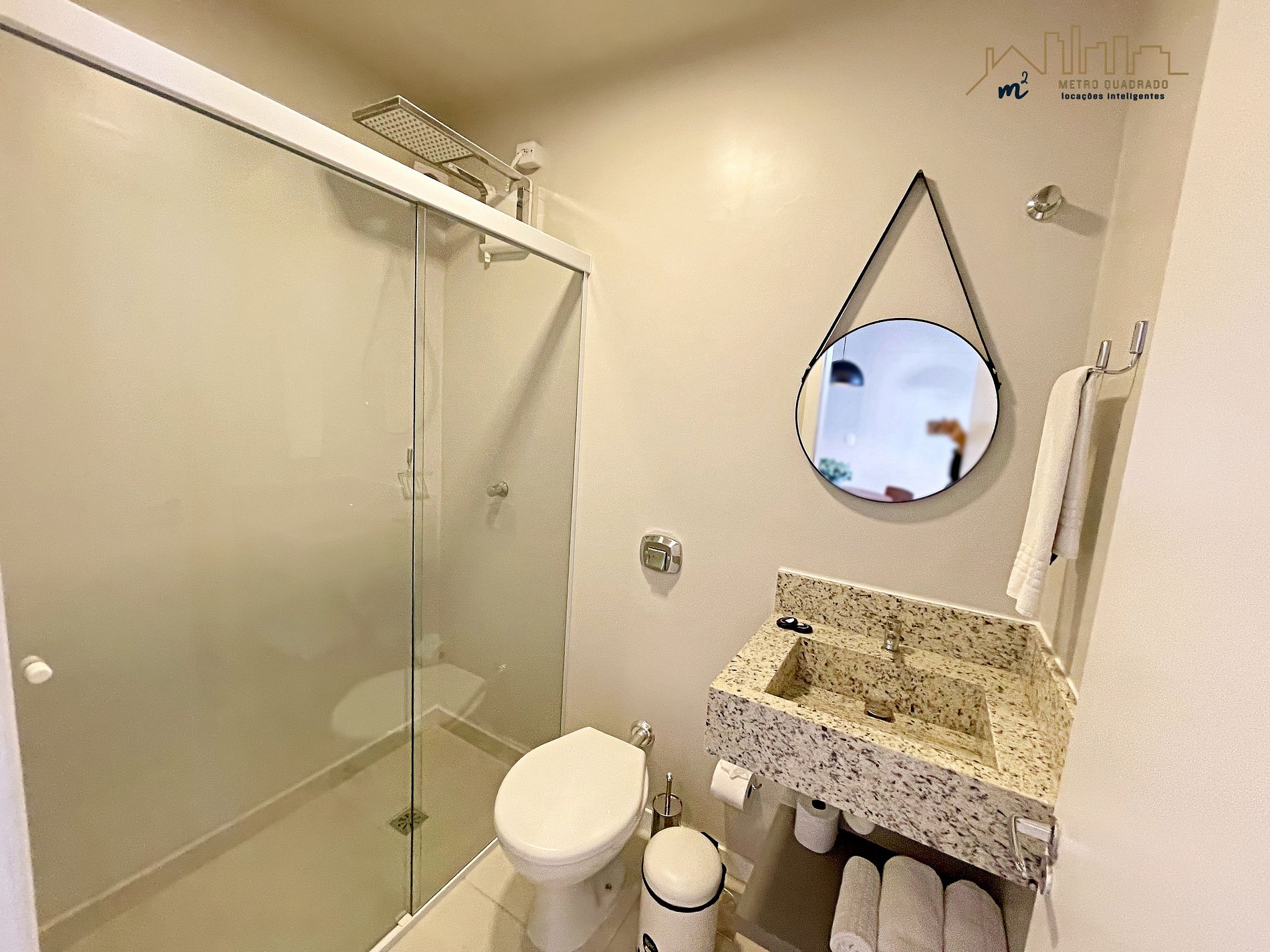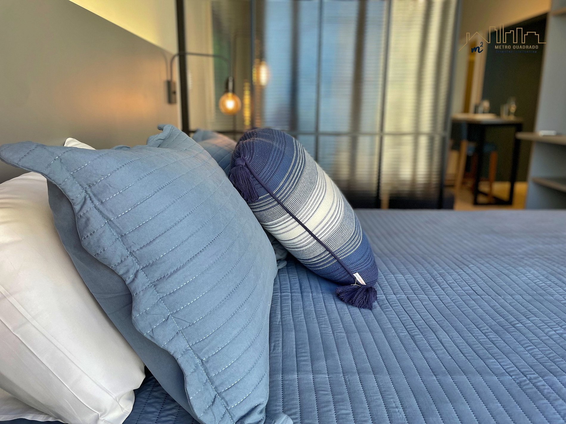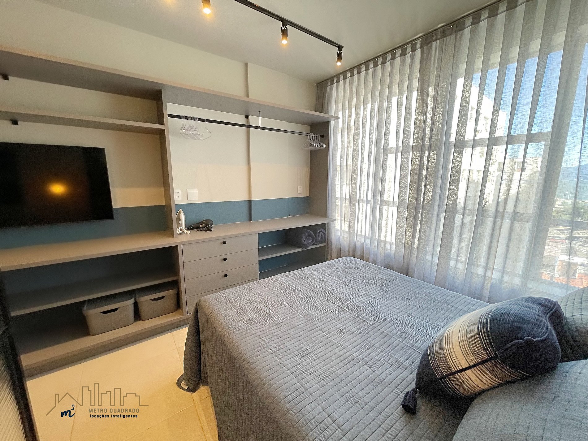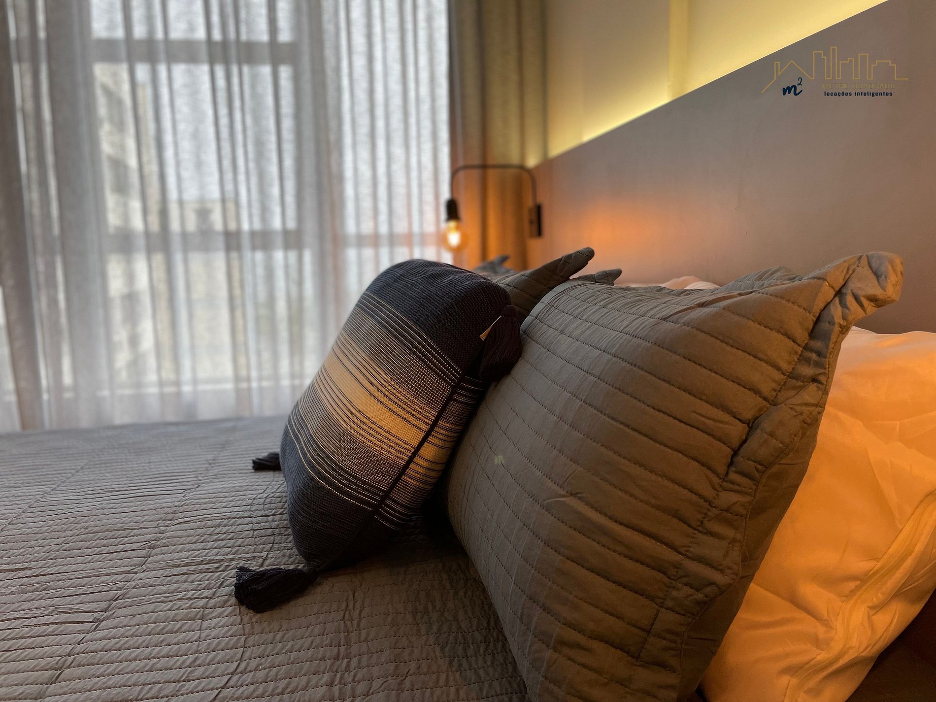 Os 38m² contam com cozinha compacta com copos, pratos, talheres, taças, panelas, cafeteira, liquidificador, microondas, forno elétrico, frigobar e cooktop por indução. Quarto com cama queen, armário com arara e cabides, sala com sofá-cama, tv smart, mesa de jantar e bancada. Possui Wi-fi próprio e ar-condicionado.