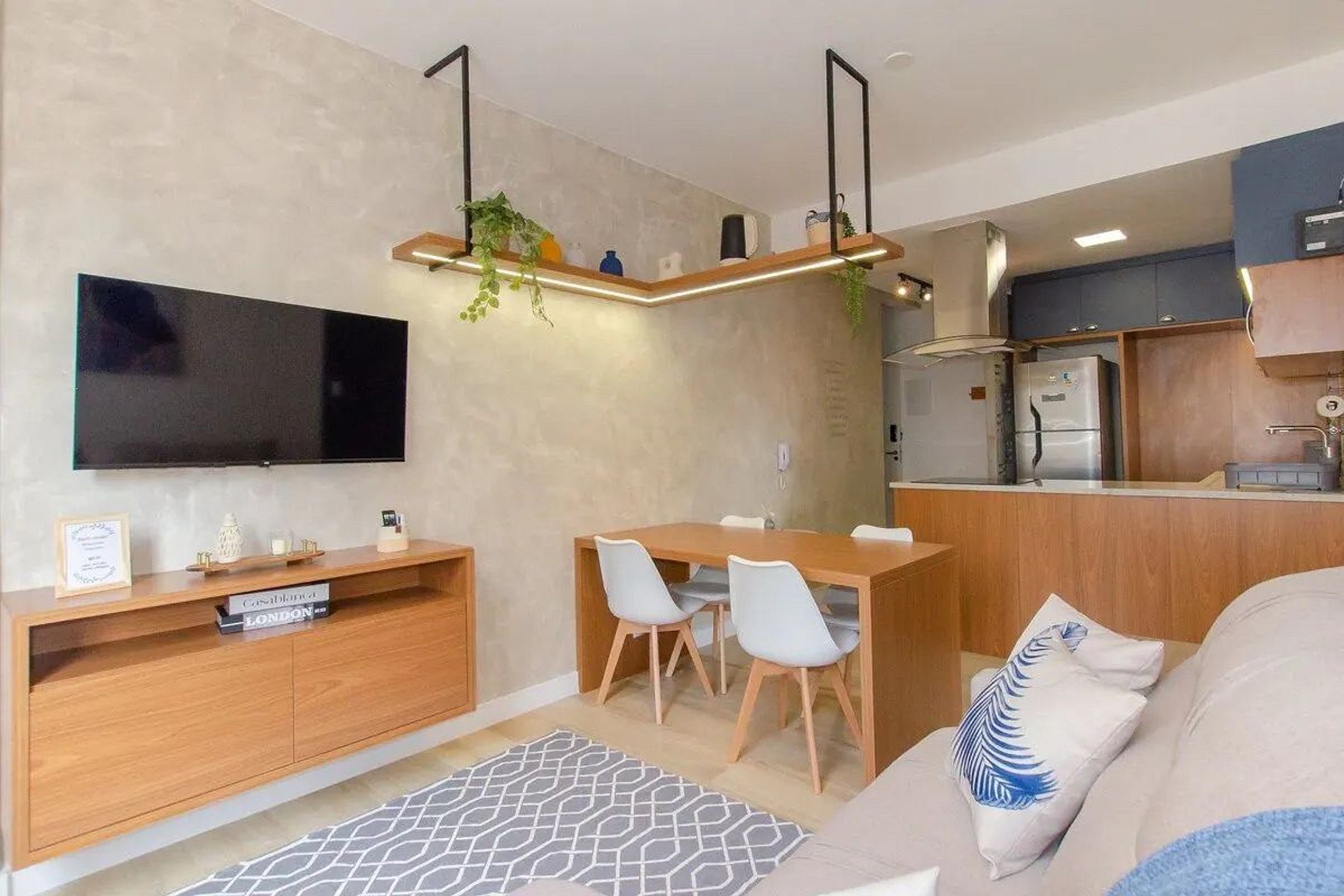 Completo com 2 quartos, um de casal e um de solteiro, escritório para home office, cozinha completa com máquina de lava e seca e sala de jantar e tv super aconchegante.