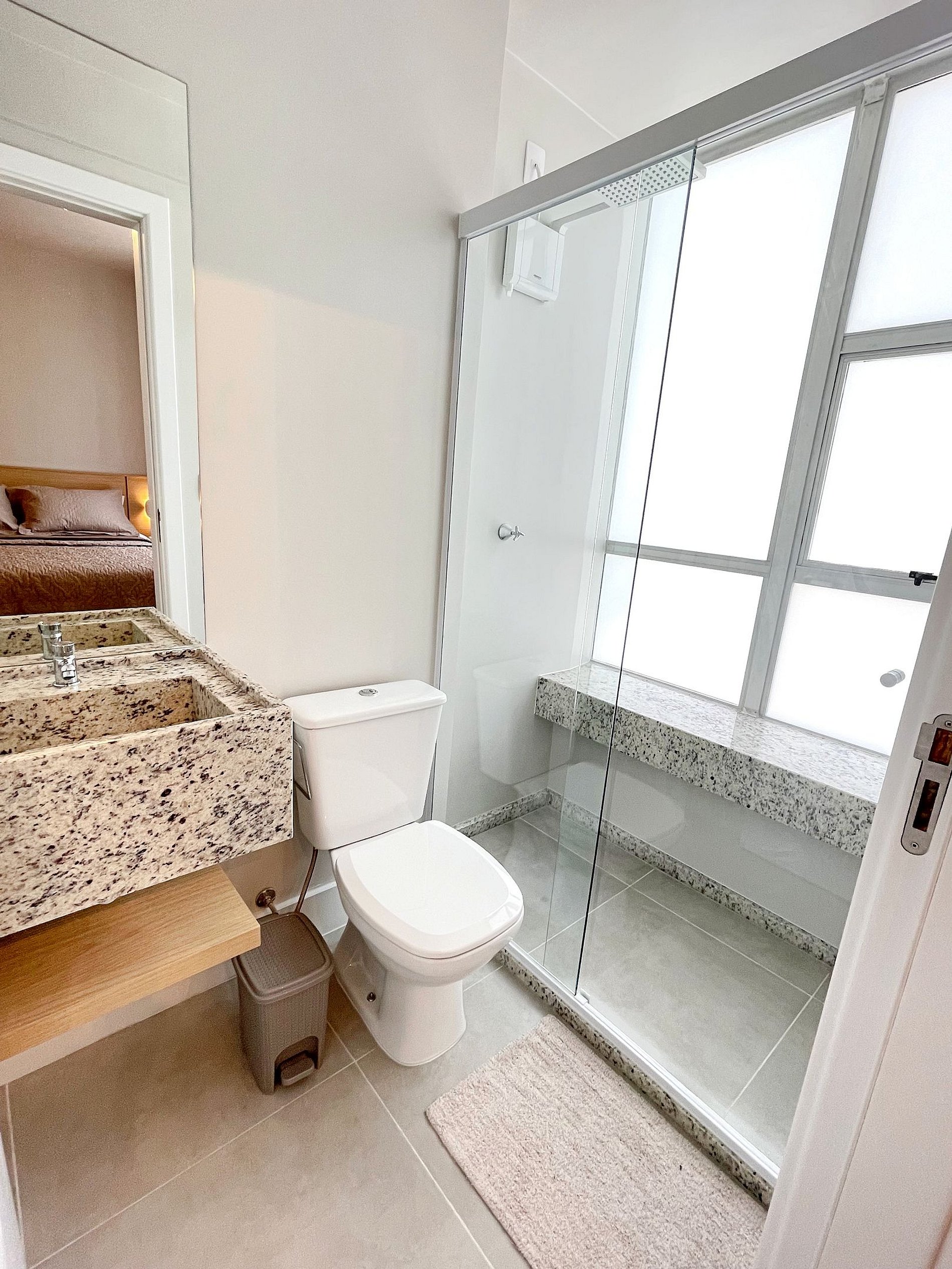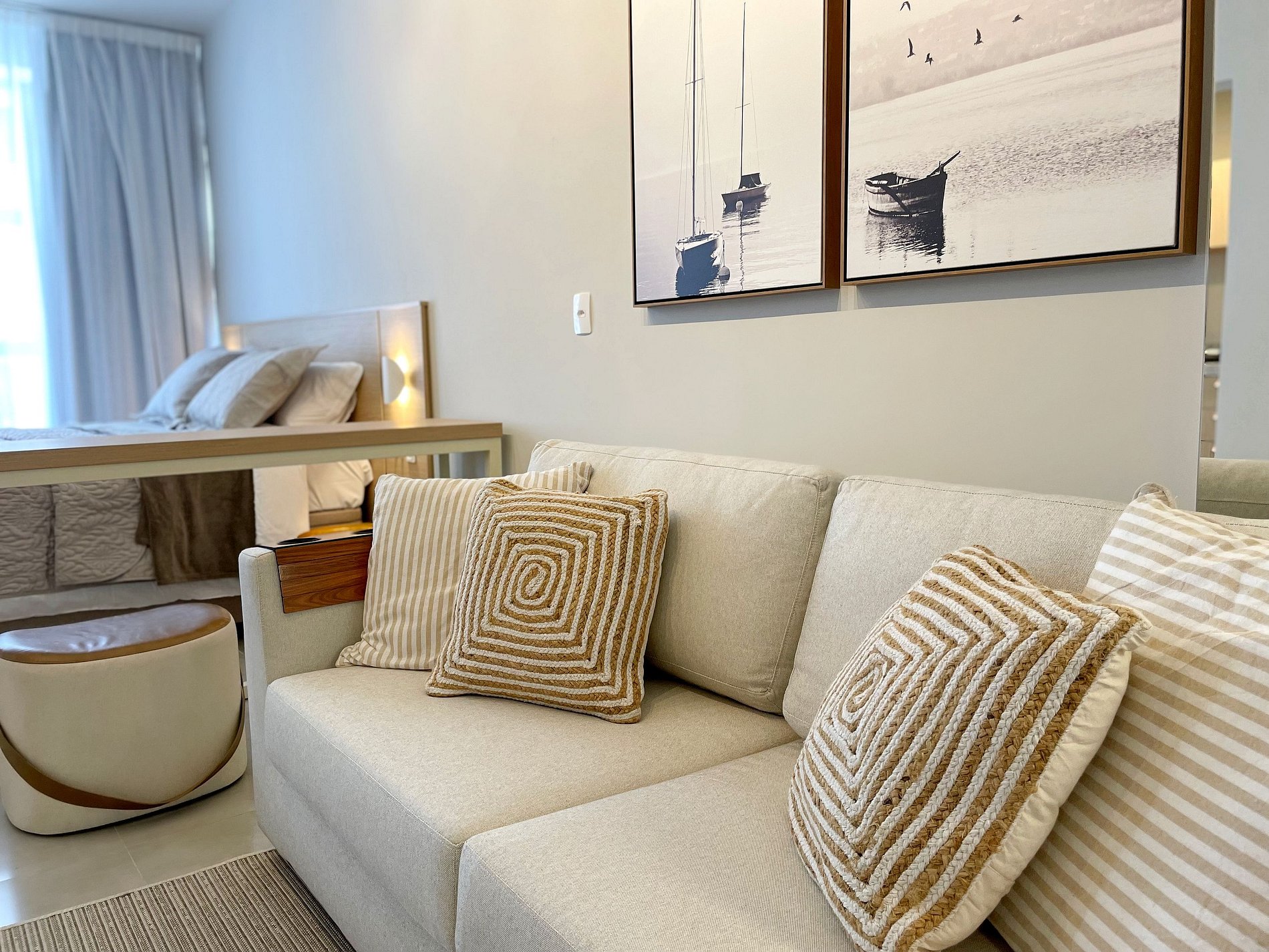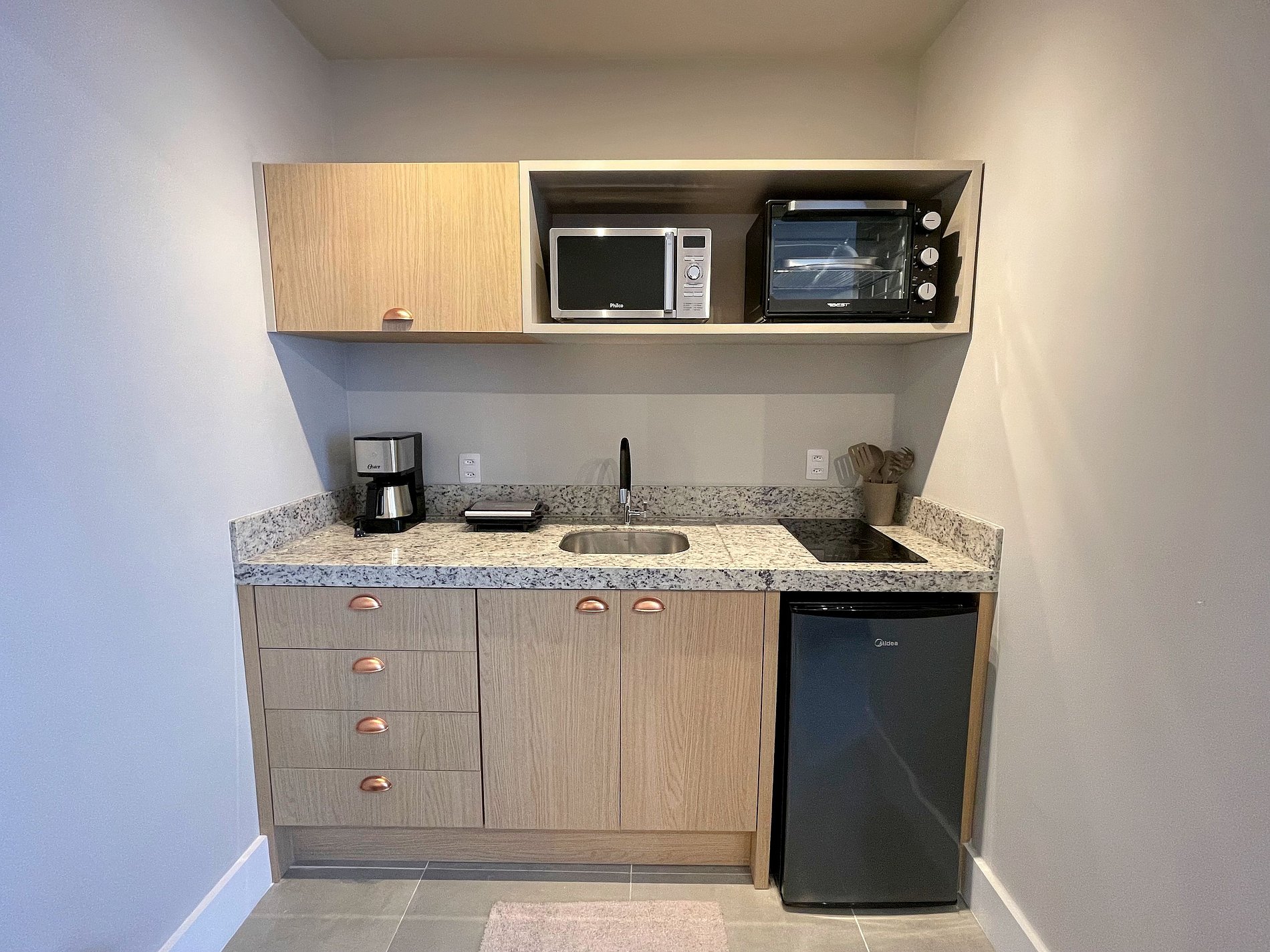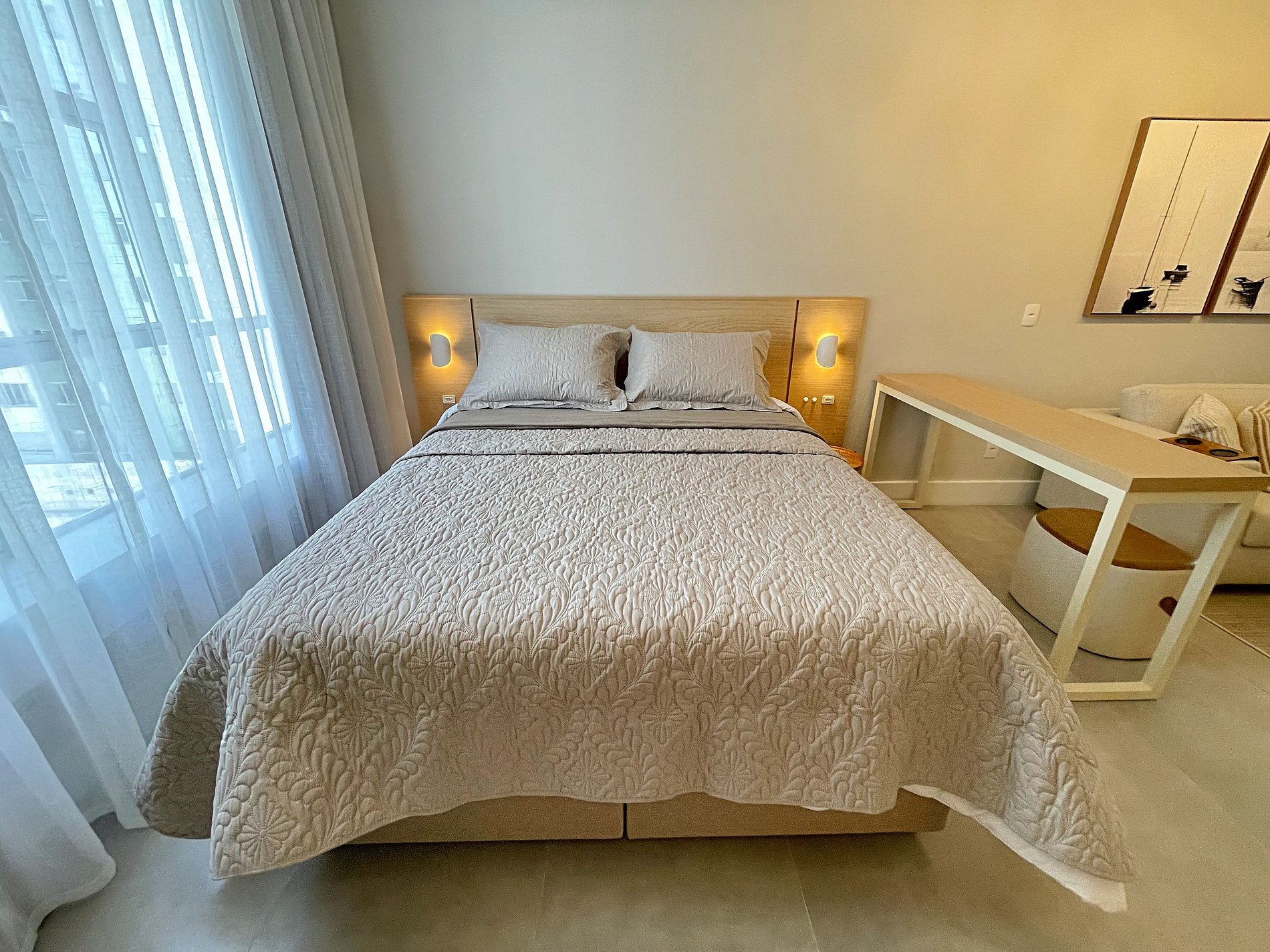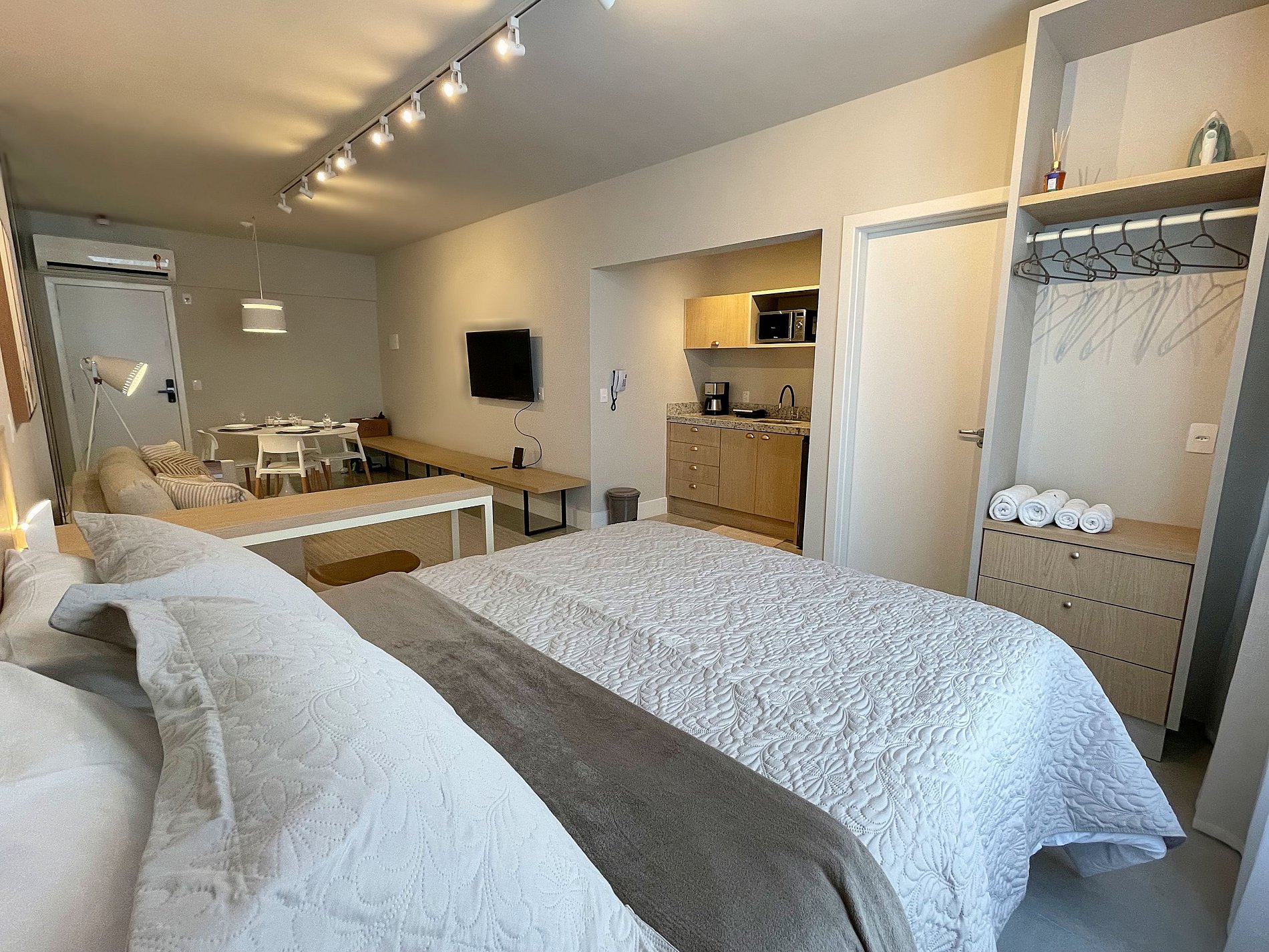 Apartamento tipo estúdio, recém reformado, moderno, minimalista e elegante. Ambiente pensado nos mínimos detalhes para o seu maior conforto durante a sua estadia, seja a passeio ou trabalho.