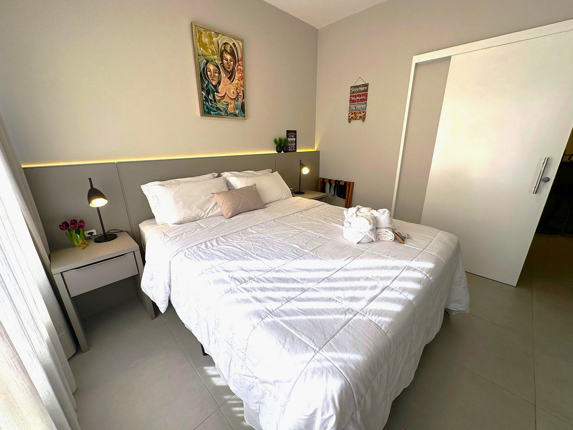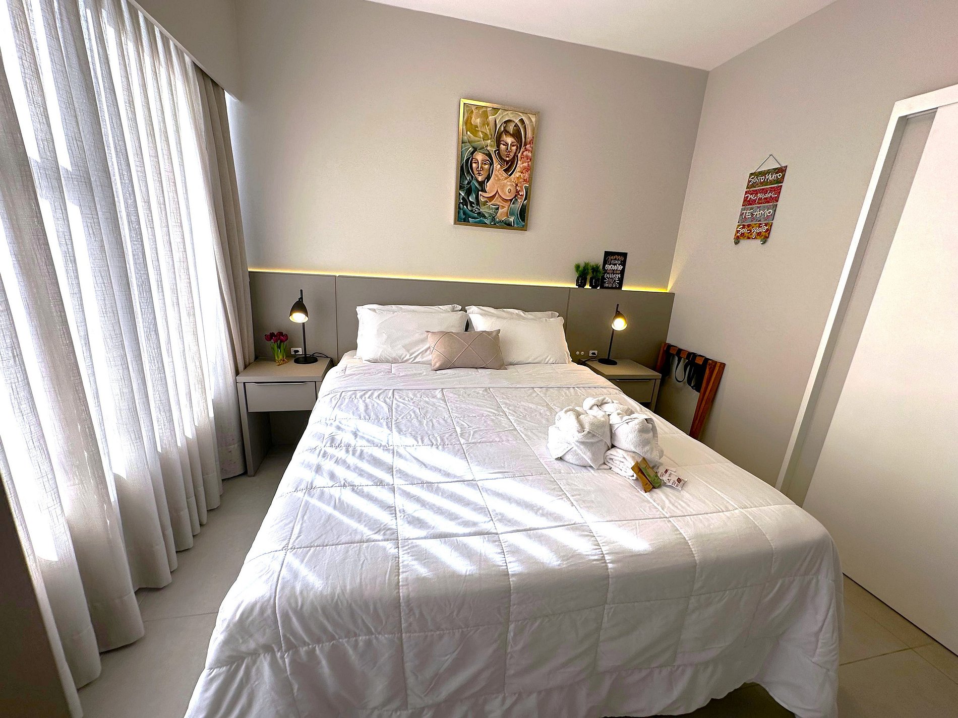O mesmo dispõe de um quarto aconchegante para casal, guarda-roupas, Smart TV e ar-condicionado. Sala de estar que possui sofá retrátil que acomoda 2 pessoas e com Smart TV, ar-condicionado e bancada para refeições. Cozinha completa com fogão por indução, forno, micro-ondas, geladeira e utensílios básicos que proporcionam uma estadia confortável. Banheiro social.
