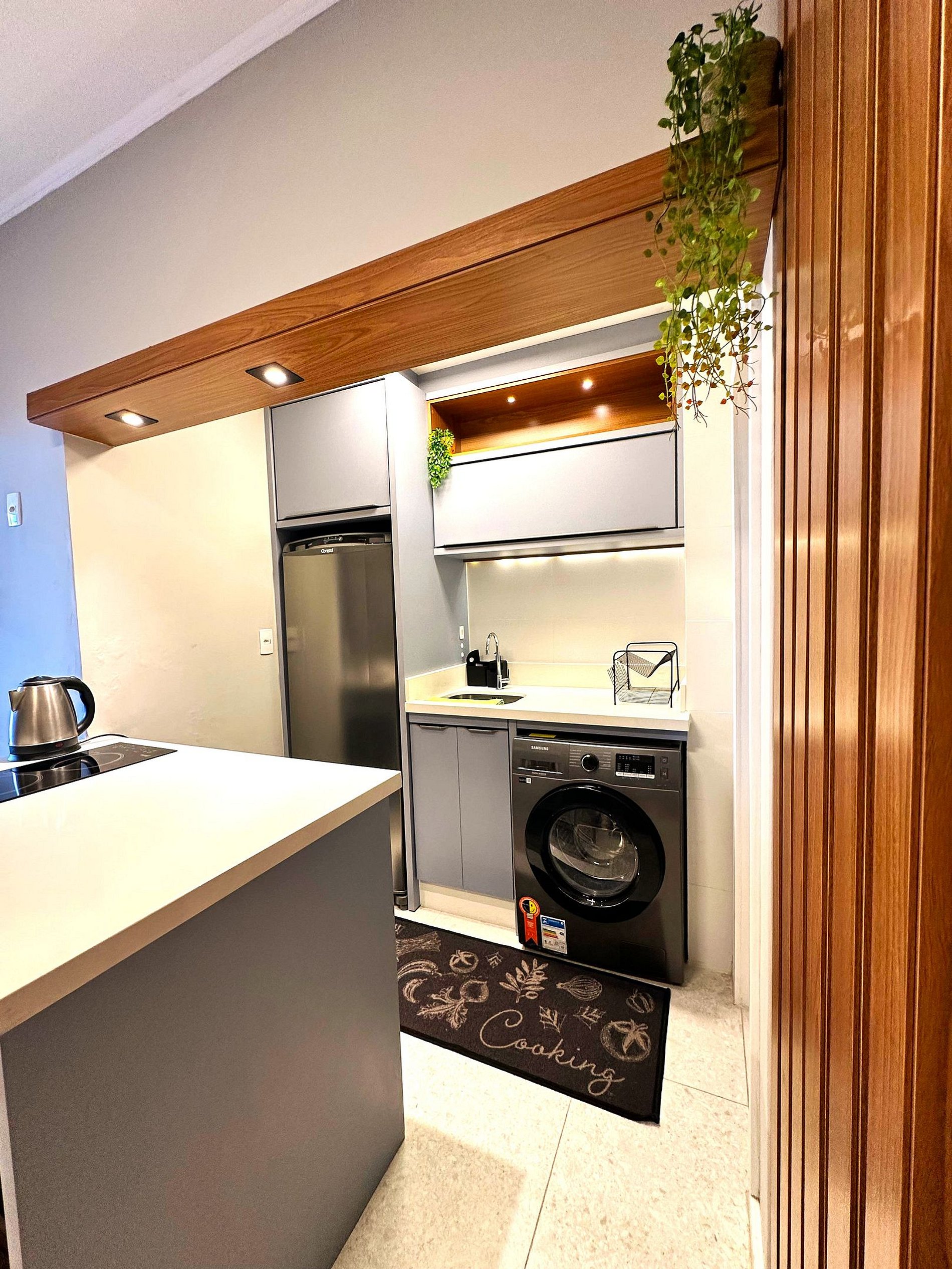 O mesmo dispõe de um quarto aconchegante para casal, guarda-roupas e ar-condicionado. Sala de estar que possui sofá retrátil que acomoda 2 pessoas, com Smart TV, ar-condicionado e mesa para refeições. Cozinha completa com fogão por indução, forno, micro-ondas, geladeira e utensílios básicos que proporcionam uma estadia confortável. Além disso, possui uma máquina lava roupas e um banheiro social.
