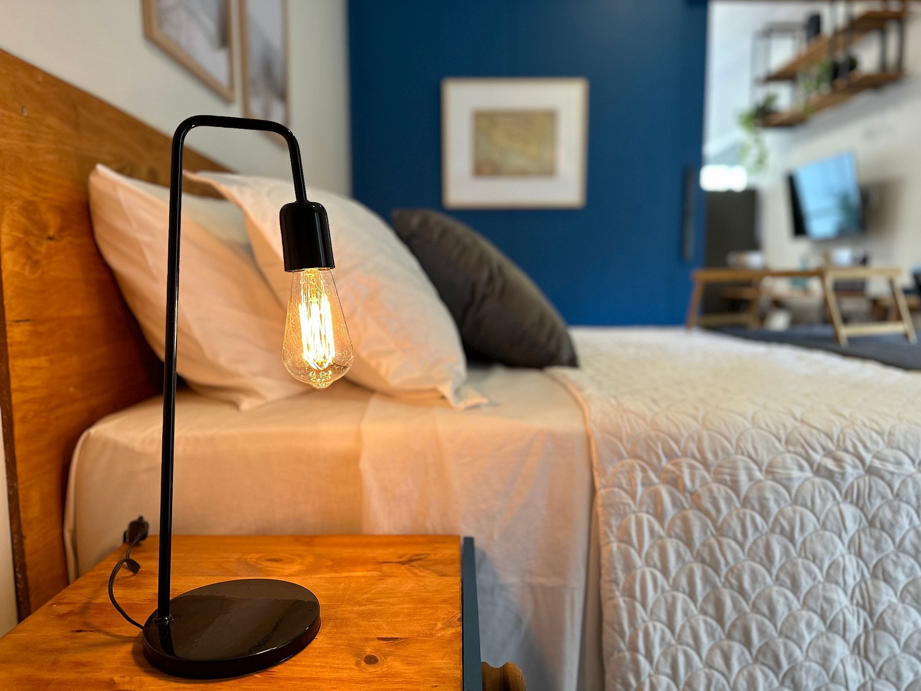 Sala com sofá-cama para uma pessoa adicional, quarto e sala separados com divisória e porta para mais privacidade.