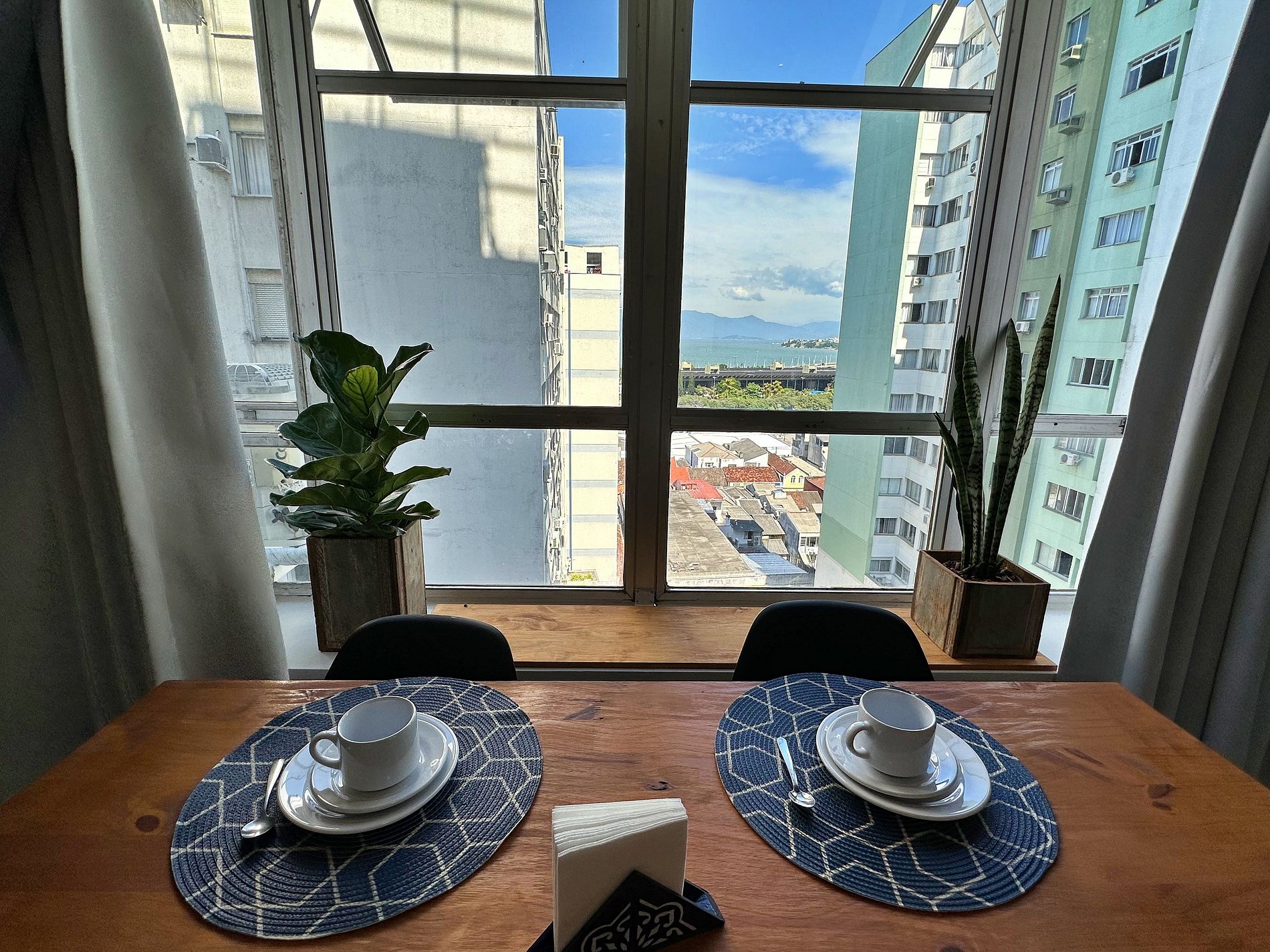 Estúdio completo no centro de Florianópolis, decorado com muito estilo e bom gosto, com vista para o mar, perfeito para sua hospedagem a passeio ou negócios.