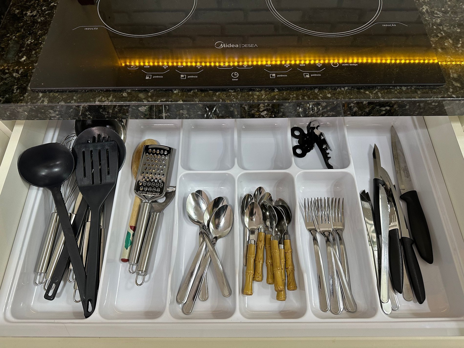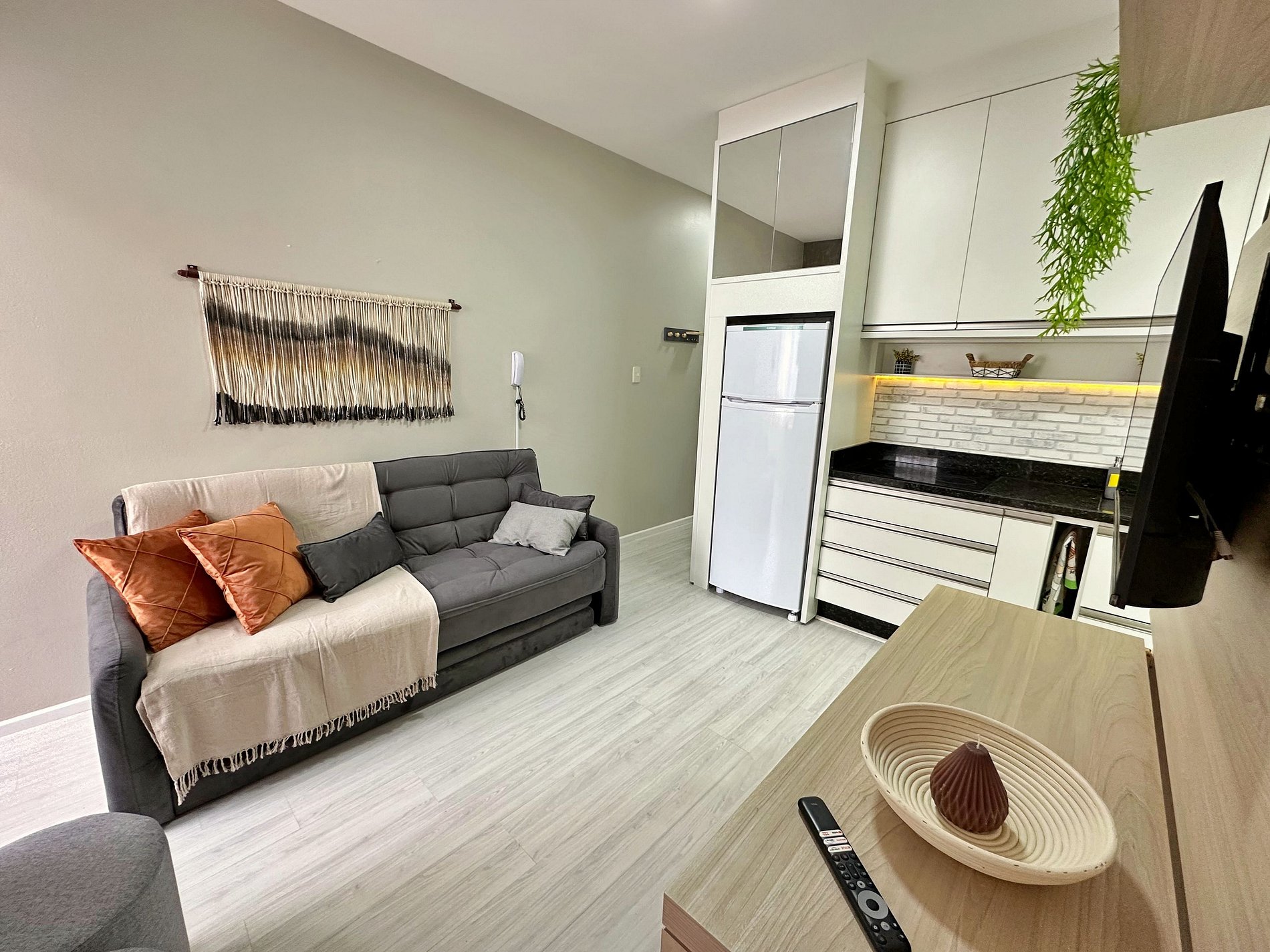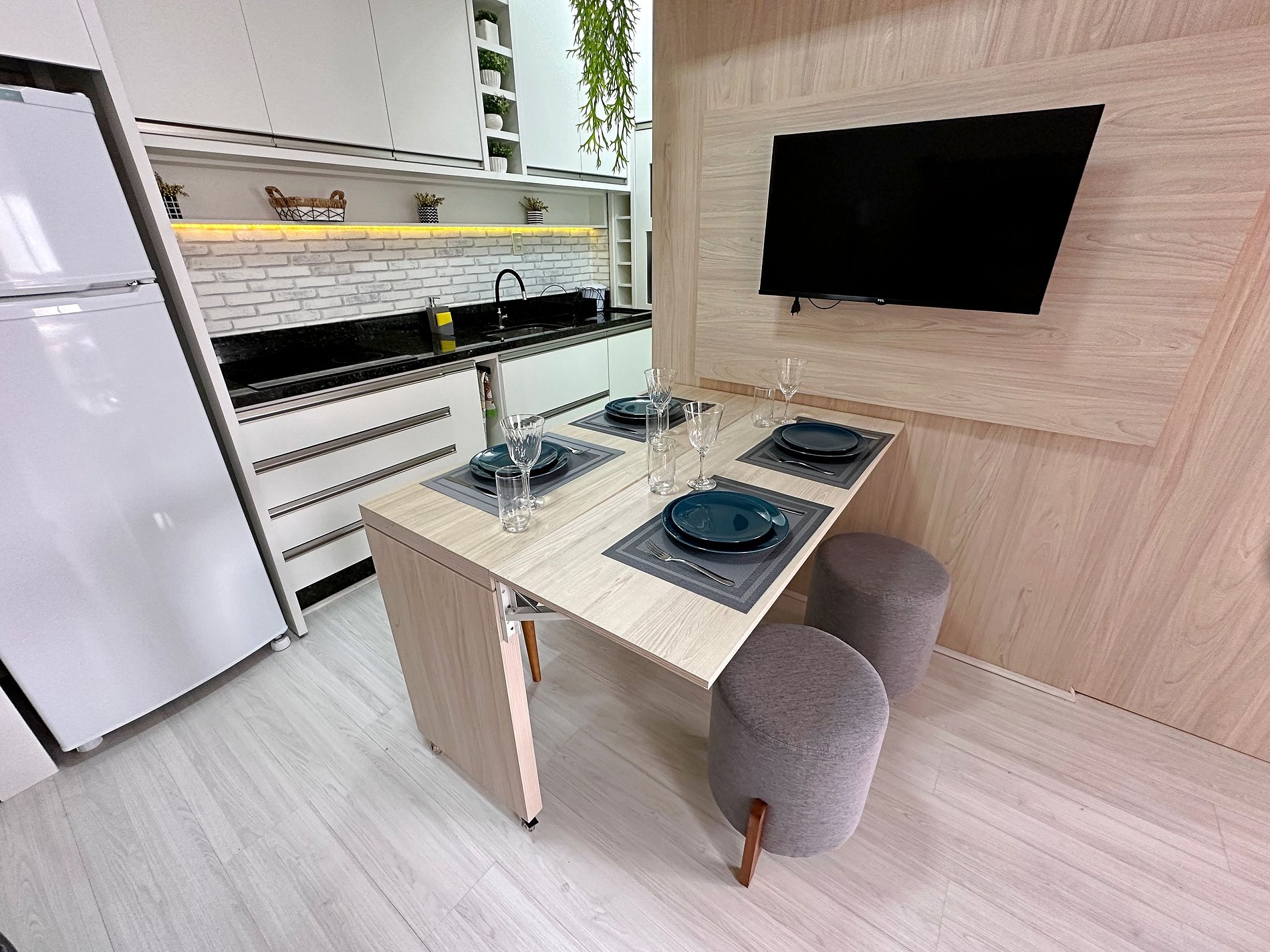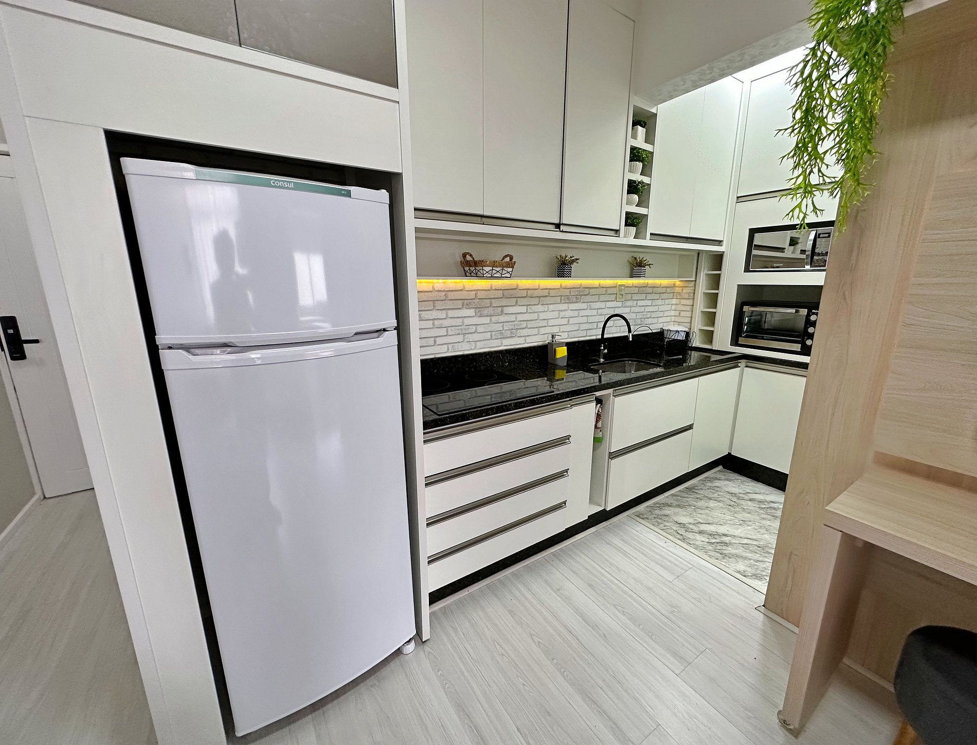O apartamento possui cozinha completa com fogão por indução 4 bocas, geladeira, micro-ondas, forno-elétrico e pia. Tem a disposição pratos, talheres, copos, xícaras, panelas, chaleira elétrica, liquidificador e cafeteira. Também dispõe de 1 quarto com cama de casal, sala com sofá-cama, espaço para utilização de laptop e banheiro. O sofá-cama da sala é confortável e acomoda 1 pessoa adulta ou 2 crianças. Possui wi-fi próprio.