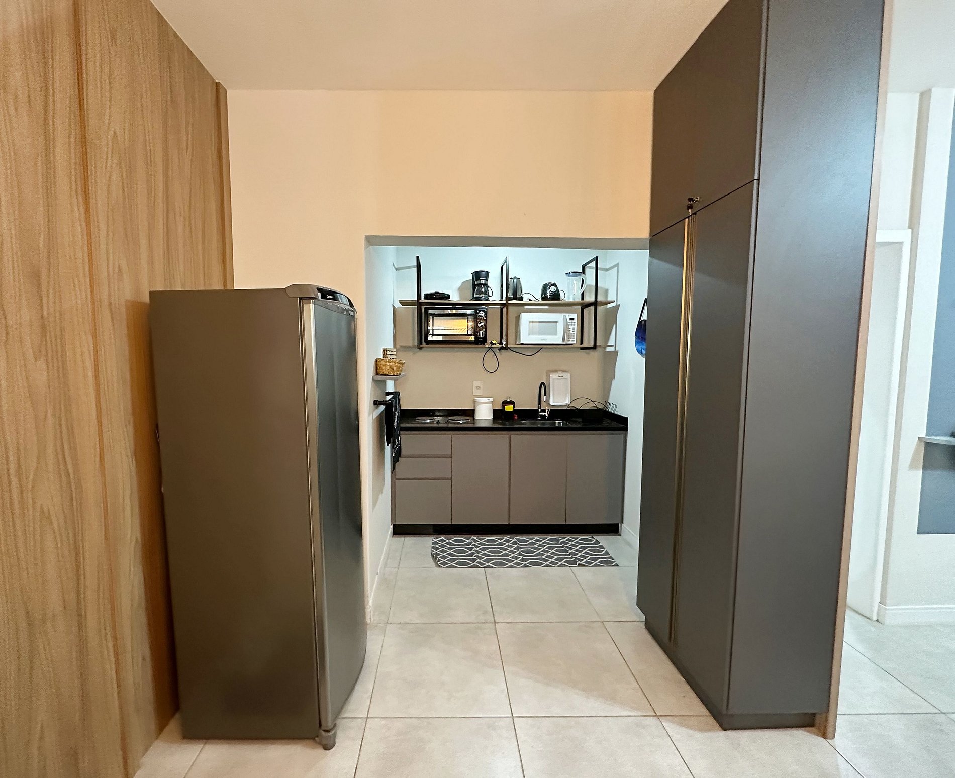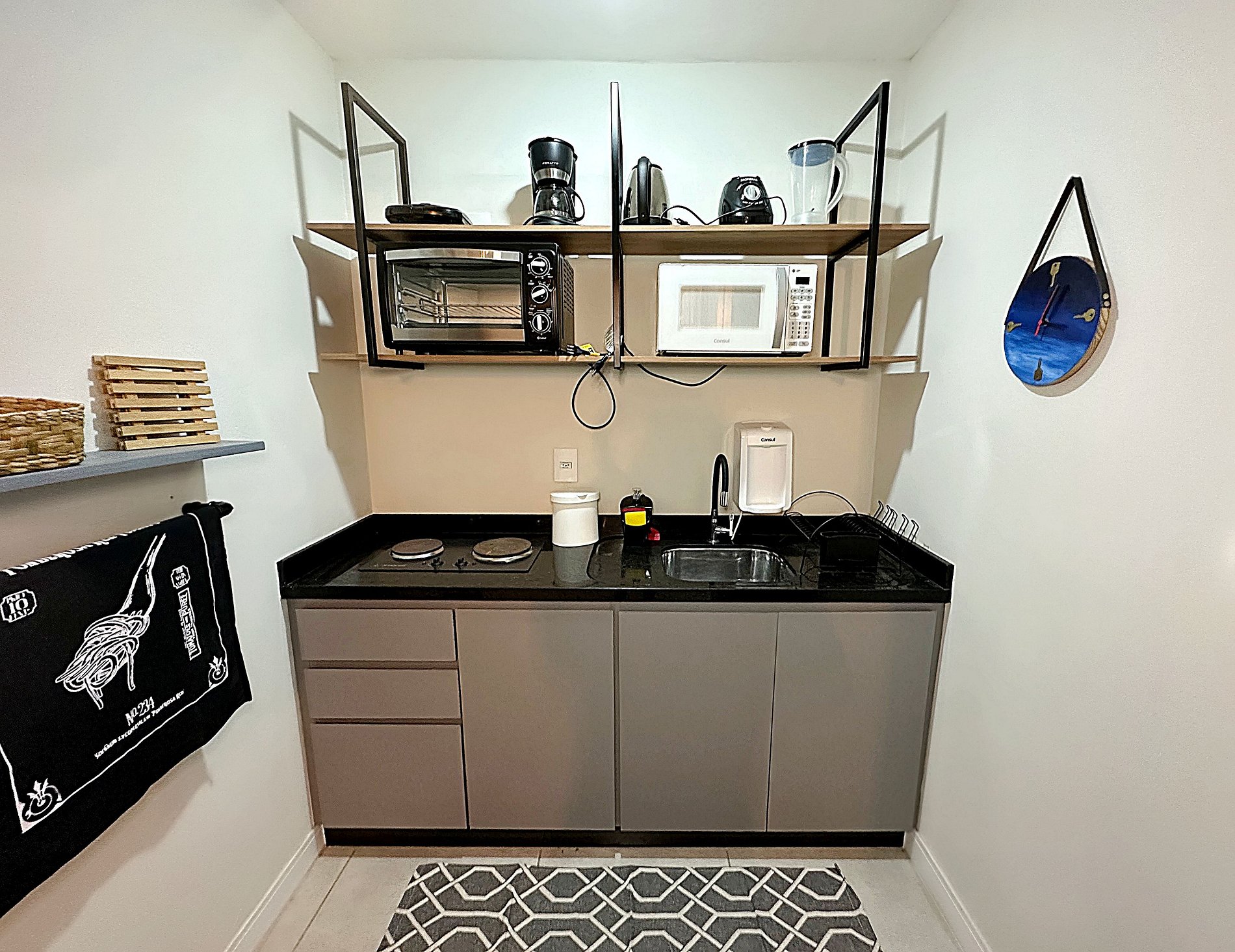 O espaço conta com uma sala com móveis rústicos e harmoniosos, trazendo conforto para sua tarde. Cozinha completa com geladeira, fogão elétrico, forno elétrico, micro-ondas, liquidificador, chaleira elétrica, cafeteira e sanduícheira, além de copos, talheres e utensílios para sua comodidade, também possui mesa para um jantar tranquilo. Possui um quarto de casal com armário e espaço para home office, e para completar um banheiro moderno e bem decorado.